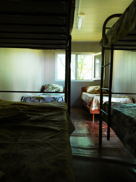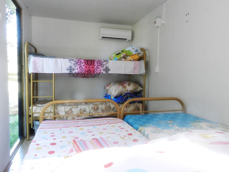 Семейный дом с 2мя спальнями, в каждой из которых расположены двухспальные кровати и одна односпальная кровать, тумбочки. Имеется общий холл с раскладным диваном, который используется как дополнительное место. В доме приготовление пищи не предусмотрено, для этого имеется общая кухня со всем необходимым на территории.