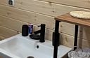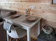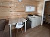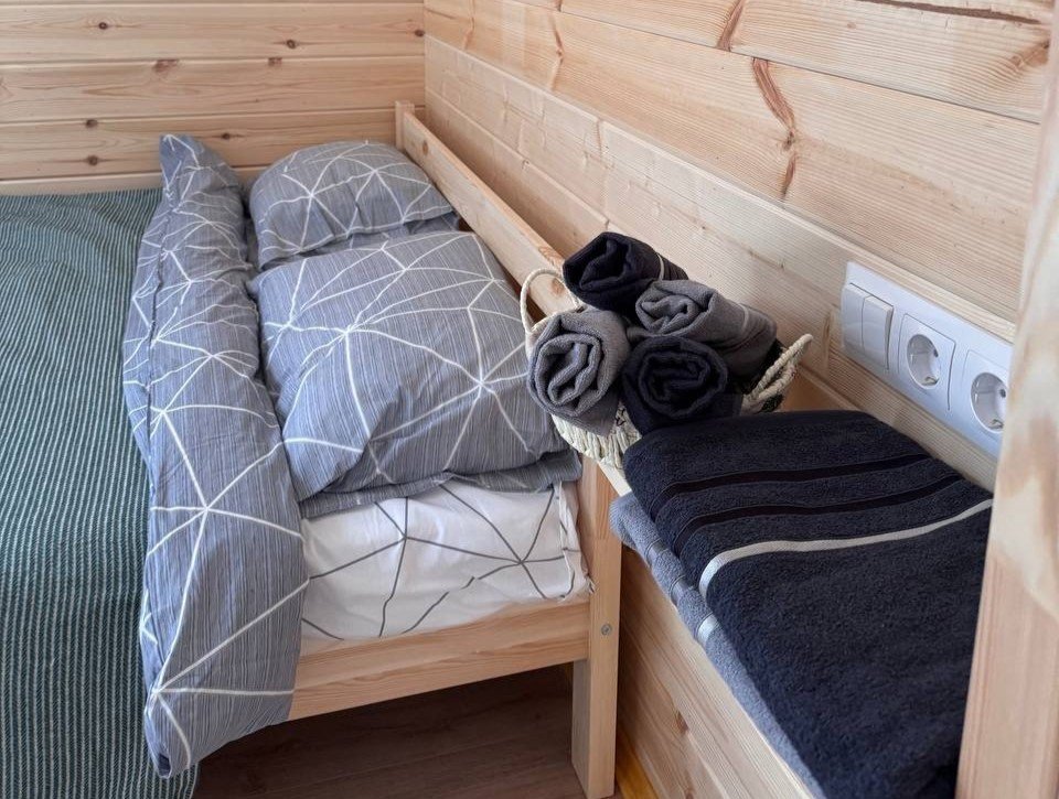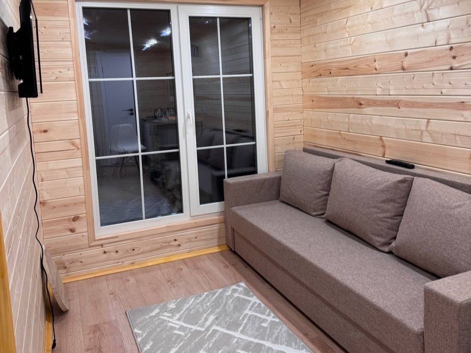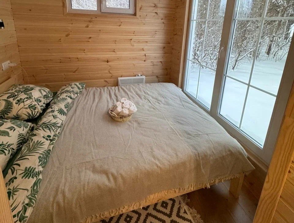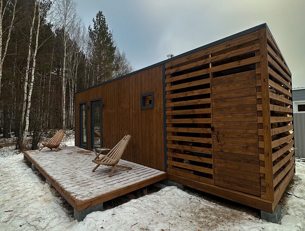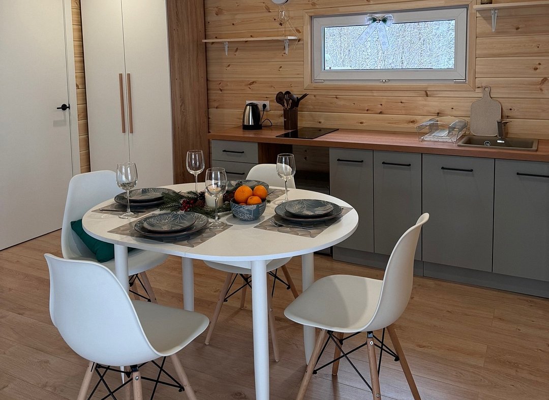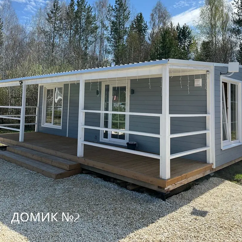 На базе предлагаются два уютных домика — малый и большой, которые вмещают 4 и 6 человек соответственно. Интерьеры домиков выполнены в современном эко-стиле. В каждом доме установлены двуспальные кровати, диваны для дополнительных мест, мини-кухня с плитой и посудой для приготовления пищи, а также гостевая зона со Smart TV и совмещенный санузел с душевой кабиной. Полотенца и постельное белье предоставляются, а также доступен Wi-Fi.