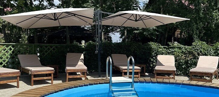 На территории базы отдыха «Рыбное место» расположен открытый бассейн, оборудованный комфортными шезлонгами и зонтами, которые защищают от палящих солнечных лучей. Чистота и ухоженность поддерживаются благодаря регулярному техническому обслуживанию.