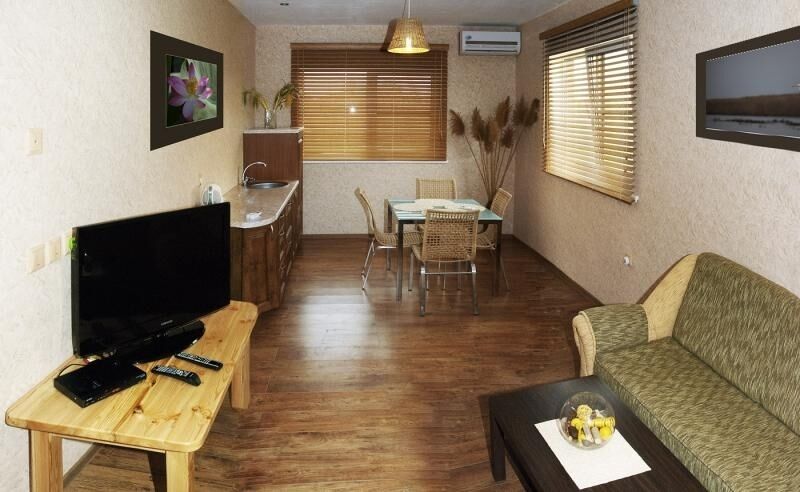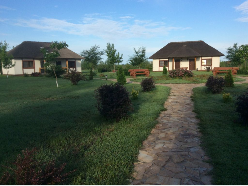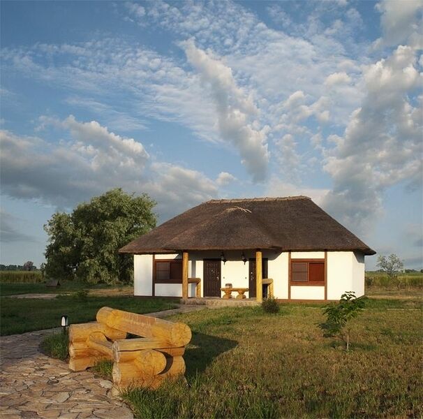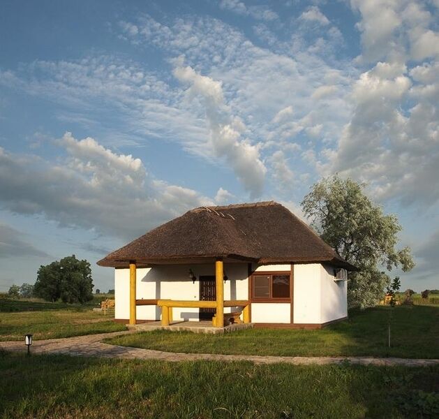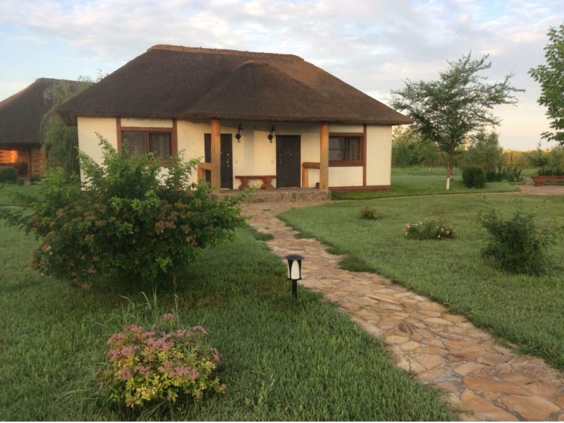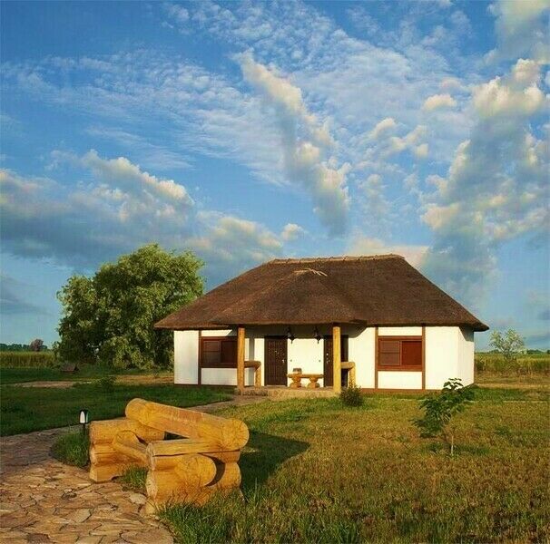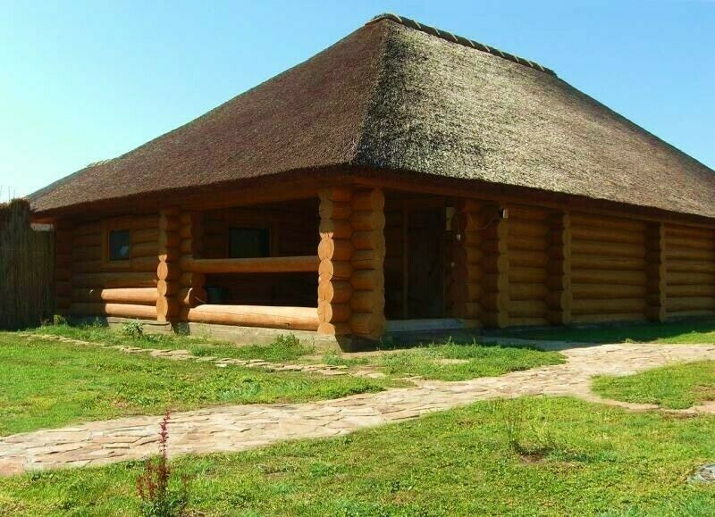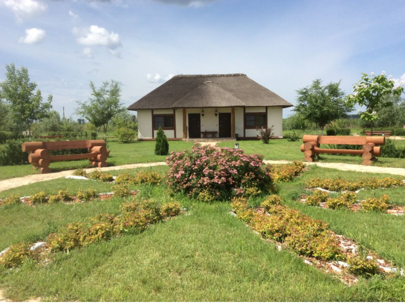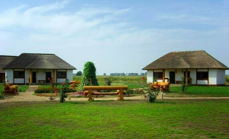 На базе 4 таких коттеджа. Комфортабельный, оригинальный и экологичный коттедж с камышовой крышей класса «Люкс». Состоит: веранда, холл-прихожая, гостиная, кухня, две спальни, сауна, ванная комната.