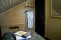 - большая двуспальная кровать (с возможностью разделения на 2 односпальные) в основной комнате и односпальная кровать в отдельной мансарде;