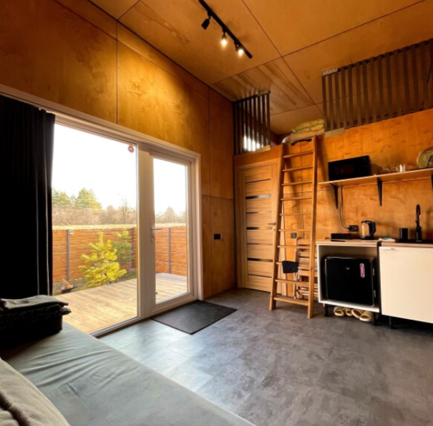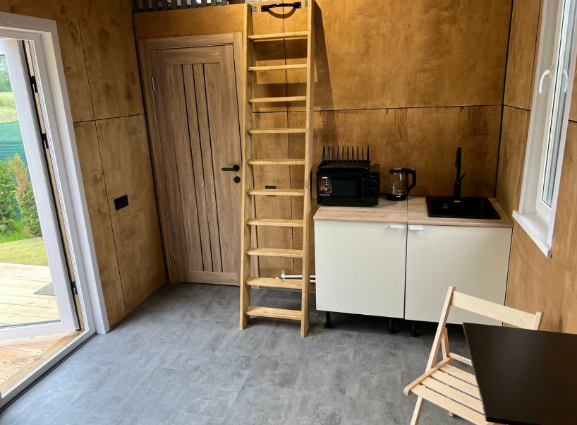 База предлагает домики для отдыха до четырёх человек. В домиках есть двуспальный матрас на мансарде и раскладывающийся диван, санузел с душем и туалетом, сауна. Предоставляются конвекторы, Wi-Fi, Смарт-ТВ, мини-холодильник, микроволновая печь. Есть кухонный гарнитур, столовые приборы, постельное бельё, полотенца, чай, гель для душа.