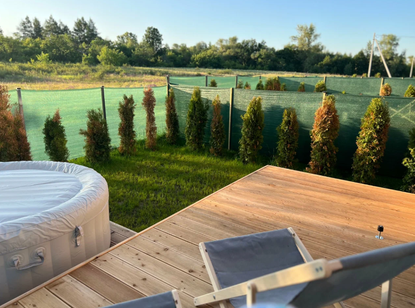 Во дворе — личная терраса, барбекю, качели с навесом, раскладной столик и стулья. Есть отдельно стоящий чан под открытым небом вместимостью 4 человека. Имеется стоянка для машин с камерами видеонаблюдения. Рядом — песчаный пляж на первой линии. Можно заняться водными прогулками, рыбалкой, катанием на сапборде. Разрешено проживание с небольшими домашними животными (есть ограничения по весу).