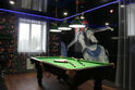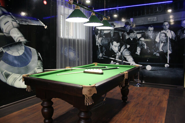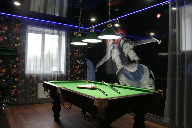 Банкетный зал вместимостью до 20 человек, с настоящим камином, плазменным TV, стереосистемой, DVD, караоке. Бильярдная комната с мебелью, спутниковым TV, DVD, караоке, танцплощадкой с шестом, массажным креслом