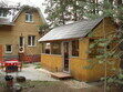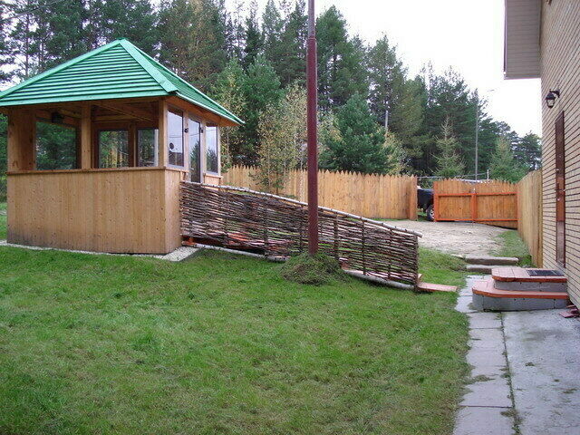 Описание: уютная беседка-дом с трёхкамерными пластиковыми окнами, освещением, отоплением, электрическими розетки. В беседке есть кухня с холодильником, чайником и микроволновкой, а также банкетная зона со столами и стульями, спутниковым ТВ, музыкальным центром. На улице – веранда и мангал.