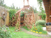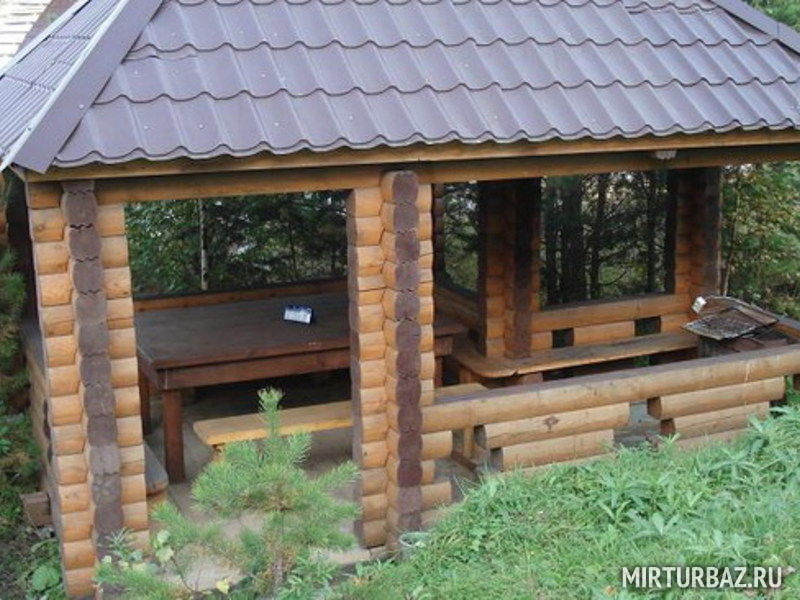 Открытая беседка с банкетным столом и скамейками, мангалом.