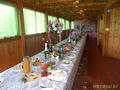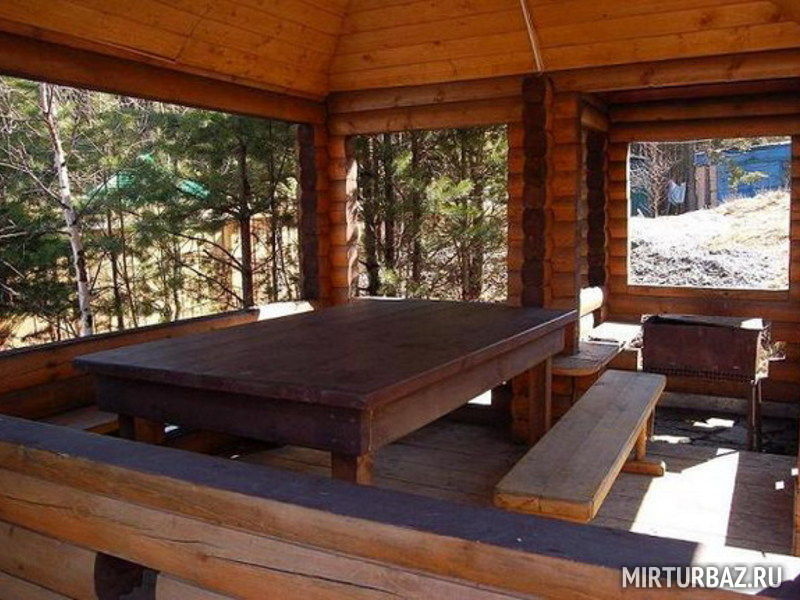 Беседка частично остеклена (открыта одна сторона), банкетный стол, скамьи, на улице – мангал.