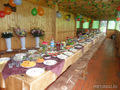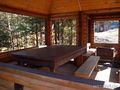 Описание: беседка-домик с трёхкамерными пластиковыми окнами, есть освещение, отопление, кондиционер, электрические розетки, банкетный стол и стулья. На улице под крышей расположен профессиональный мангал подставкой под казан.