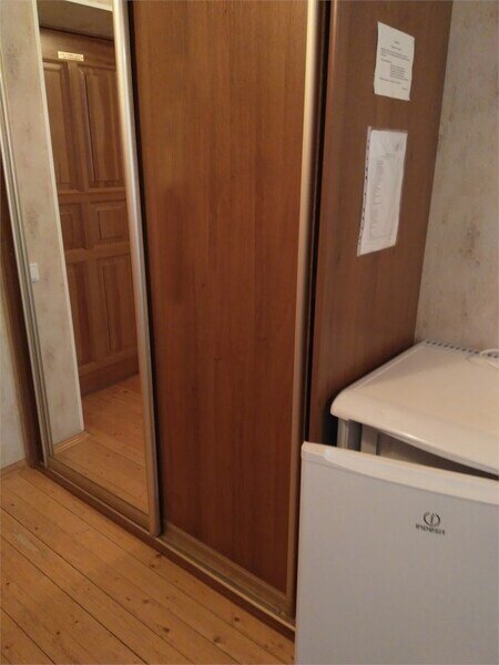 В номере односпальные кровати. Стол, стул, шкаф, розетки. На этаже общий душ, с/у, холодильник.
