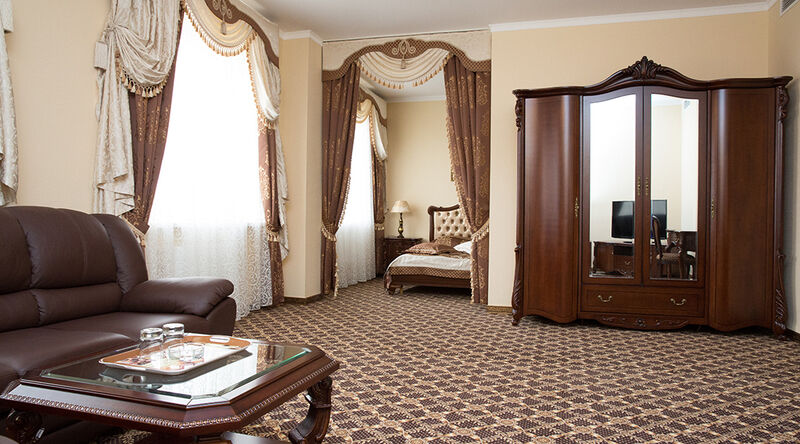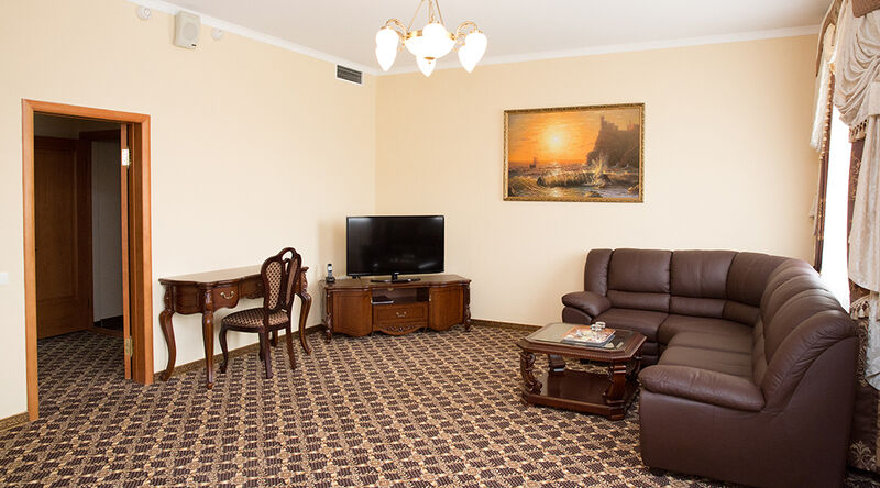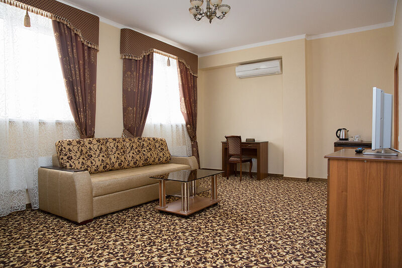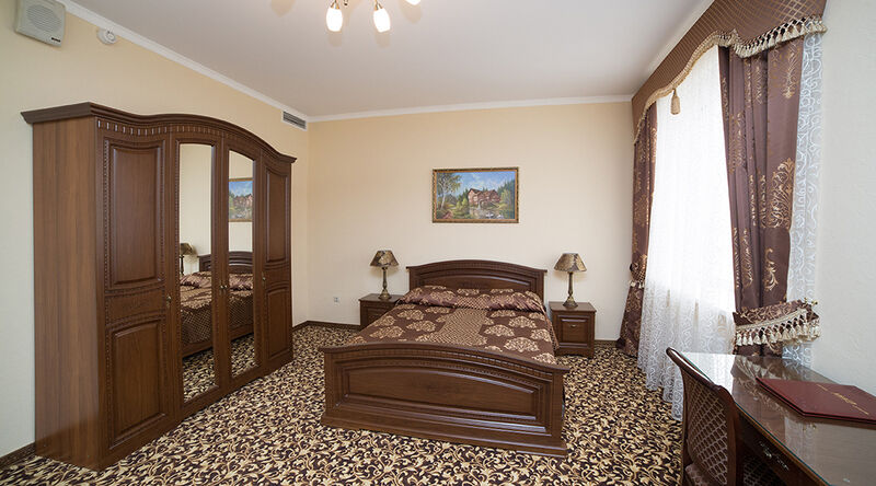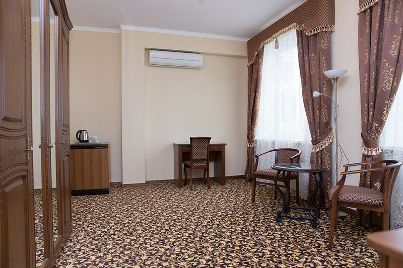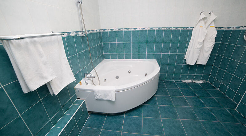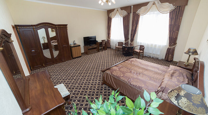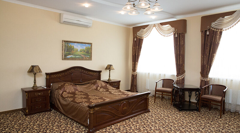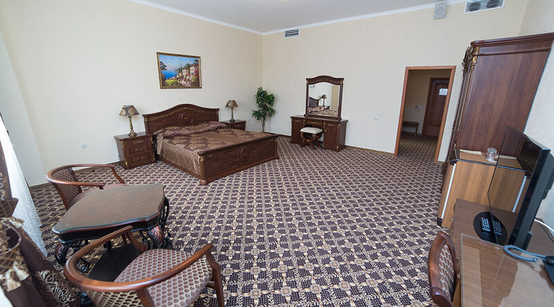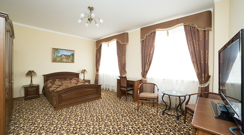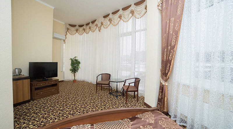В номере двухспальная кровать, шкаф, письменный стол, туалетный столик, телевизор, телефон, холодильник, кондиционер ,чайник, фен, полотенца, халаты, тапочки, средства личной гигиены. Ванная комната с джакузи.