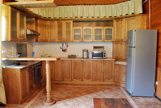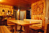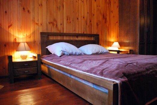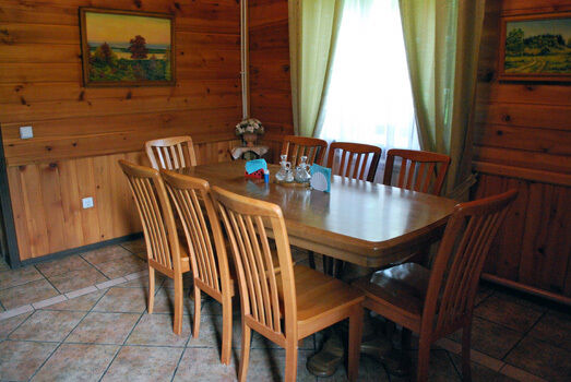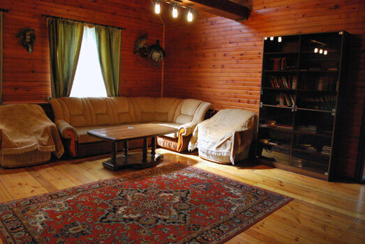 На первом этаже Гостевого дома есть два двухместных номера, меблированных односпальными кроватями, общий санузел, холл с камином, сервантом с посудой, стол и стулья. Есть холодильник, телевизор, DVD, караоке, баня без бассейна. На втором этаже – четыре двухместных номера с отдельными санузлами и большими двухспальными кроватями.