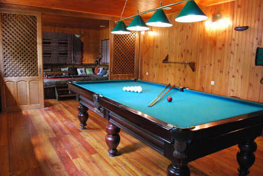 На втором и третьем этажах дома располагаются три двухместных номера с двуспальными кроватями и диванами и санузлами. На первом этаже находится роскошная кухня-столовая со всей необходимой мебелью и техникой, каминный зал с банкетным столом, баня-сауна с душевой и басейном, и бильярдная с диваном для кальяна. Рядом с домом находится крытая беседка и мангал.