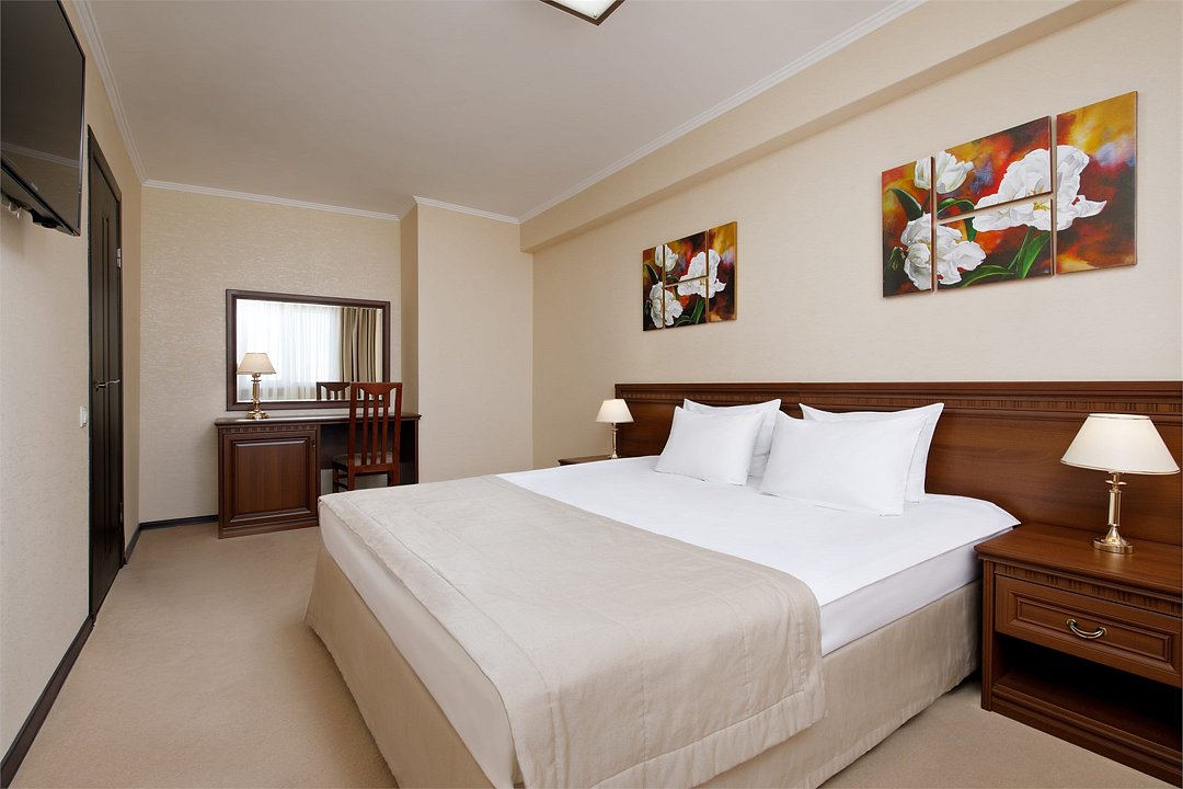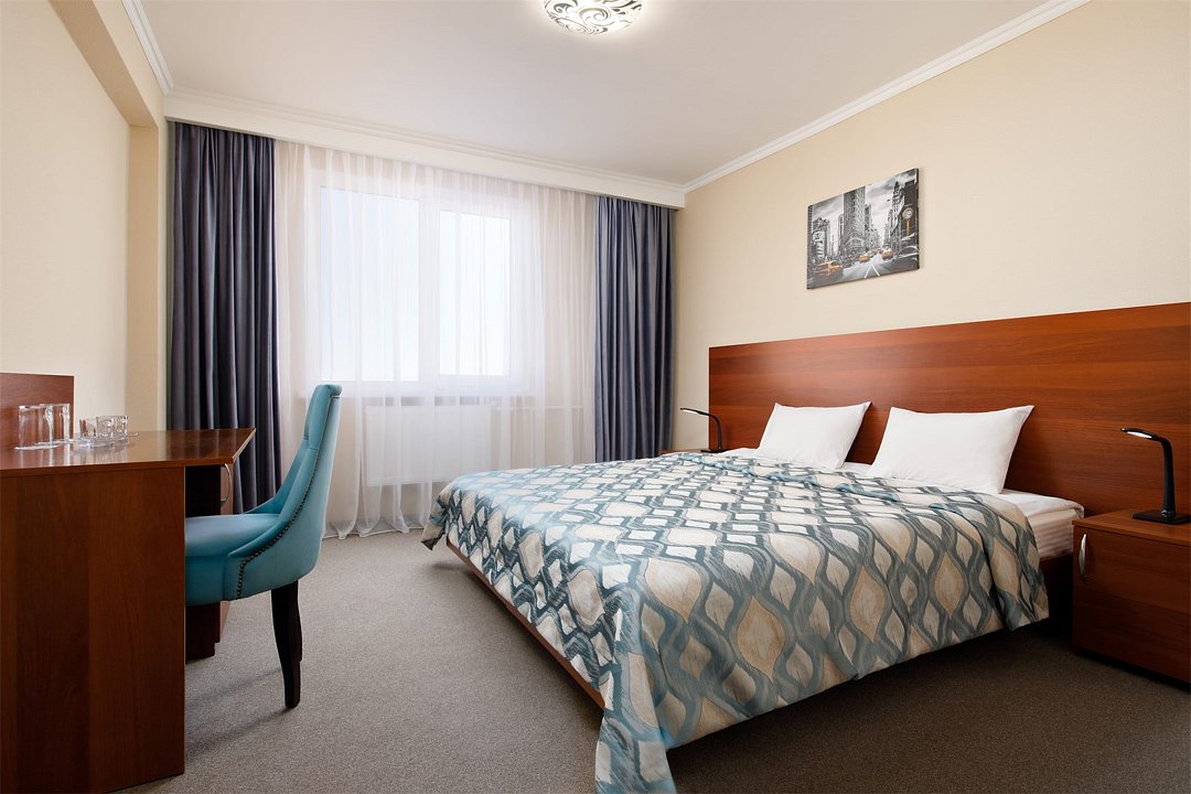 Уютный двухместный номер – идеальный выбор для делового человека прибывшего в наш город. Удобная двухспальная кровать, письменный стол, плазменный телевизор, холодильник, телефон, WI FI, санузел с душевой кабиной или ванной. Завтрак включен в стоимость номера.Услуги и удобства