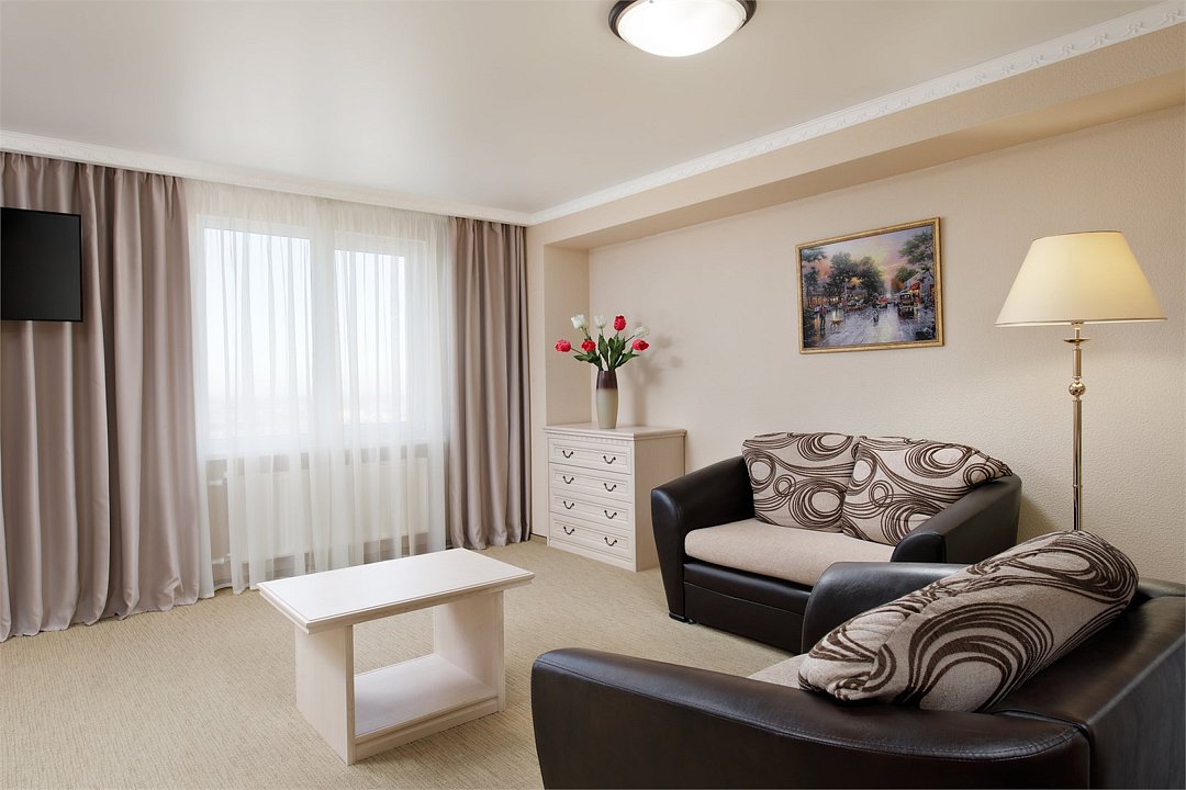 Уютные одно/двухкомнатные номера с Евро ремонтом - это рациональная и функциональная организация пространства, обеспечивающая вам комфорт во время работы, отдыха и приема гостей. На 39 кв. метрах расположено все необходимое для проживания: спальная зона с удобными кроватями, рабочая зона с письменным столом и креслом, санузел с душем и другие незаметные, но важные для удобства и максимального комфорта наших гостей принадлежности. В Каждом номере "Комплимент" от администрации гостиницы: чай/кофе/питьевая вода.Услуги и удобства