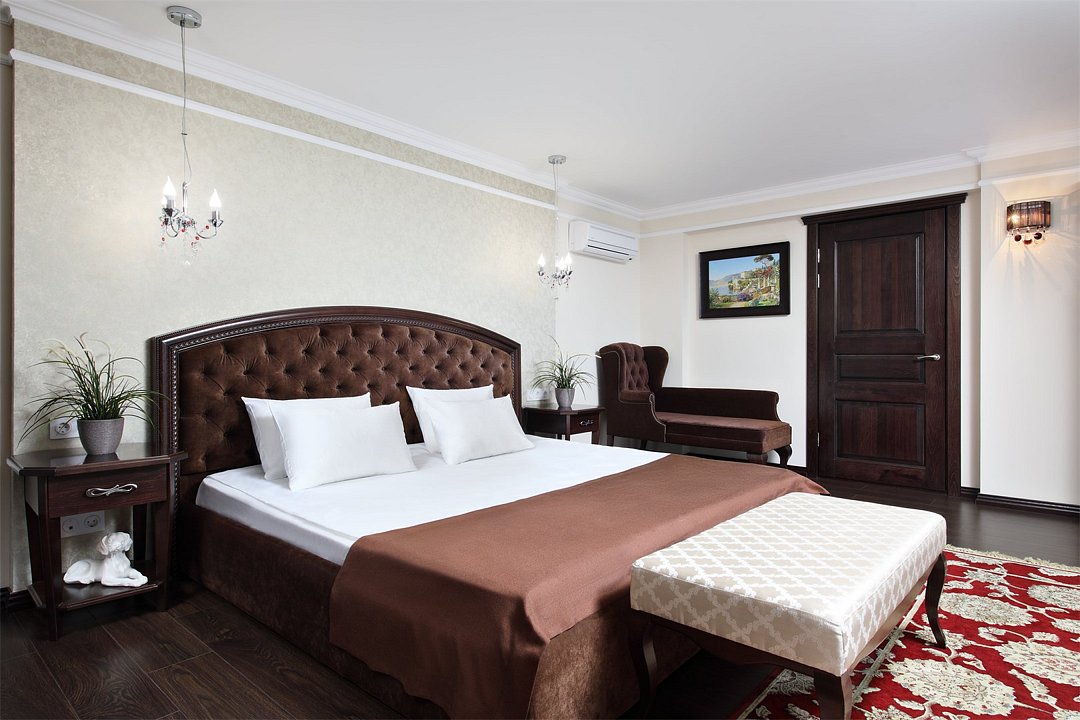 Комфортные светлые номера с Евро ремонтом 2015 г. Удобная мебель. Двуспальная кровать, размером 180 см. x 200 см. В каждом номере к услугам гостей предоставляется бесплатный набор для приготовления чая и кофе, большой плазменный телевизор, 50 кабельных каналов. Помимо бесплатного доступа в интернет, WI FI в номерах есть телефон и индивидуально регулируемый кондиционер. В ванных комнатах, душ, фен, тапочки, гигиенические принадлежности.Услуги и удобства