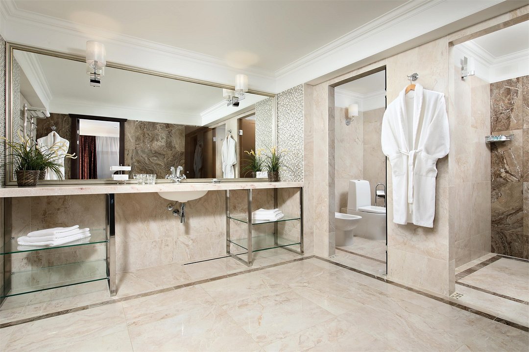 кабельное телевидение, Wi-Fi, телефон, холодильник, кондиционер, светильник, настольные лампы, фен, электронные замки, кофемашина, ванная с джакузи, санузел, дополнительный санузел, дополнительная ванная комната, теплый пол, банные принадлежности, халаты, банные полотенца, тапочки, гигиенические средства, косметические средства, сауна, кровать «King size», диван, кресла, тумбы, стулья, шкаф для одежды, вешалки, журнальный столик, письменный стол, обеденный стол, зеркало, пуфики, ковер, эксклюзивная мебель, мебельный гарнитур, две комнаты, звуконепроницаемые стены и окна, чайный набор, набор посуды, обслуживание номеров, информационная карта, меню, сейф, минеральная вода, чайник, унитаз, раковина, косметическое зеркало, питьевая вода, гостиная зона, отопление, душ, вид на город, стаканы, столовые приборы, туалетный столик, три телевизора, парна́я, уборка номера, услуги прачечной (платно), бутылка вина, шапочка для душаВ номере