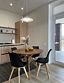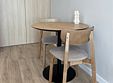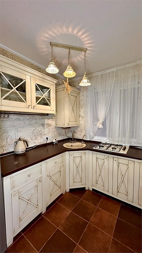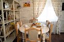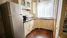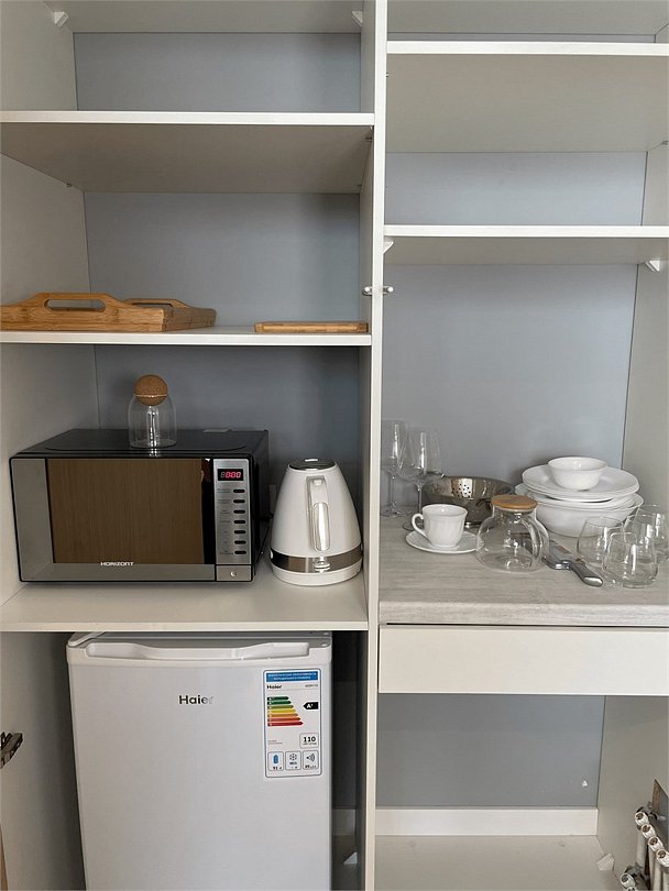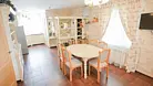 В большой комнате кухонная зона с печкой и кофемашиной, полный набор посуды, гостиная со столом на шесть человек, диваном (раскладным), телевизором, камином и теплым полом.