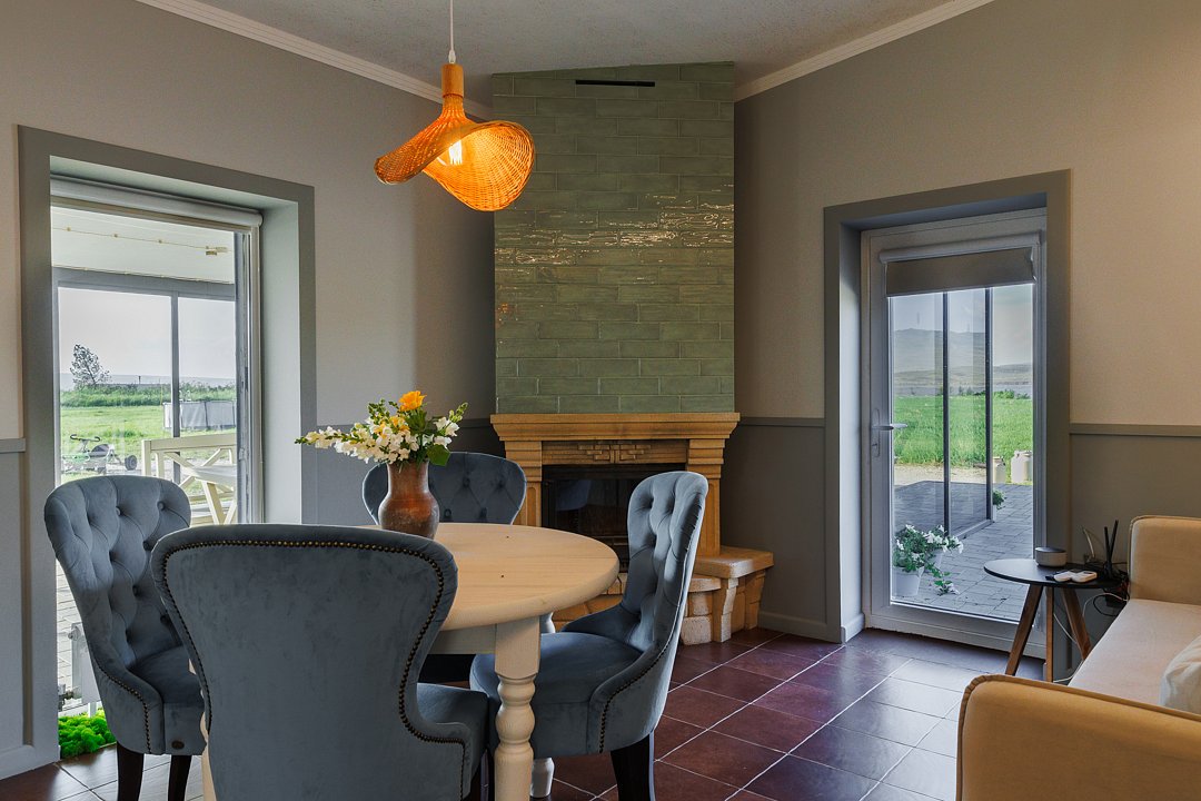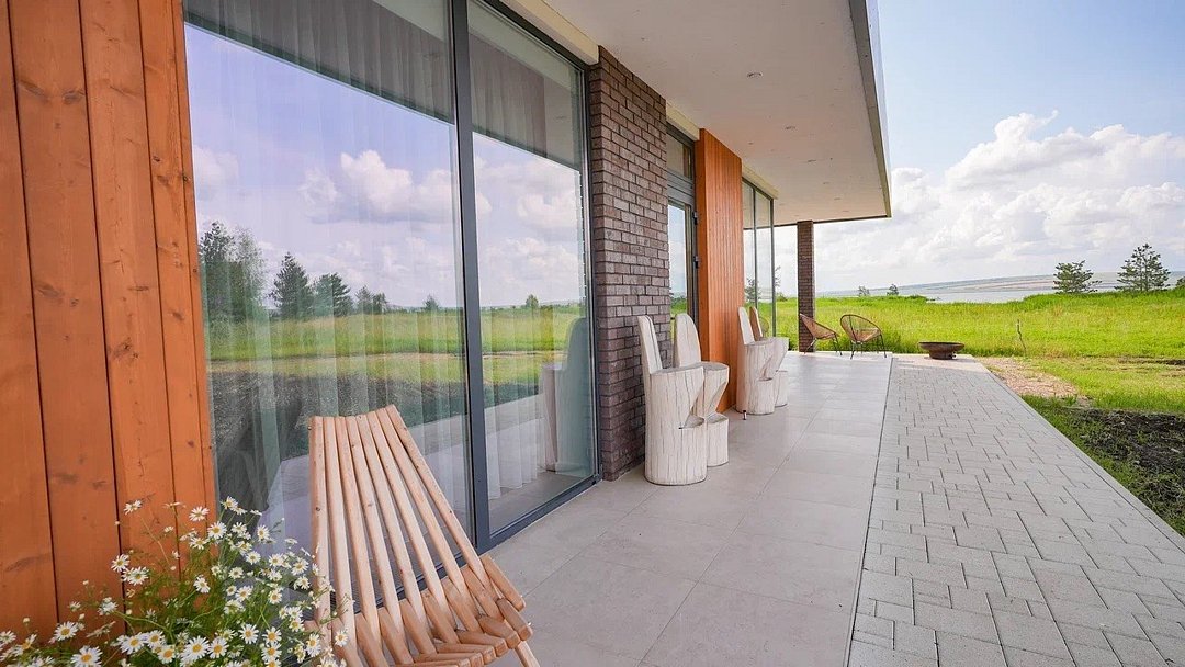 Двухкомнатный домик — двуспальная кровать в отдельной комнате, большой раскладной диван в другой комнате, два санузла. Полноценная кухня, два телевизора, камин, терраса и своя мангальная зона. Панорамные окна в пол с видом на озеро, теплые полы и вся необходимая посуда.
