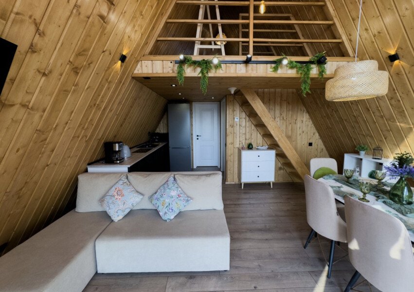 Каждый дом оснащен всем необходимым для комфортного проживания: мини-кухней, уютной гостиной и спальней, а также санузлом с душем. Гости могут воспользоваться современными удобствами, такими как сплит-система, холодильник, посудомоечная машина и мощная Wi-Fi сеть.