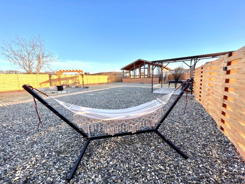 Домик «Закат» на участке 5,5 соток и с видом на Сенгилеевское озеро и равнины Кавказа. В домике 6 спальных мест, 2 отдельных спальни с двуспальными кроватями и кухня-гостиная с раскладывающимся диваном.
