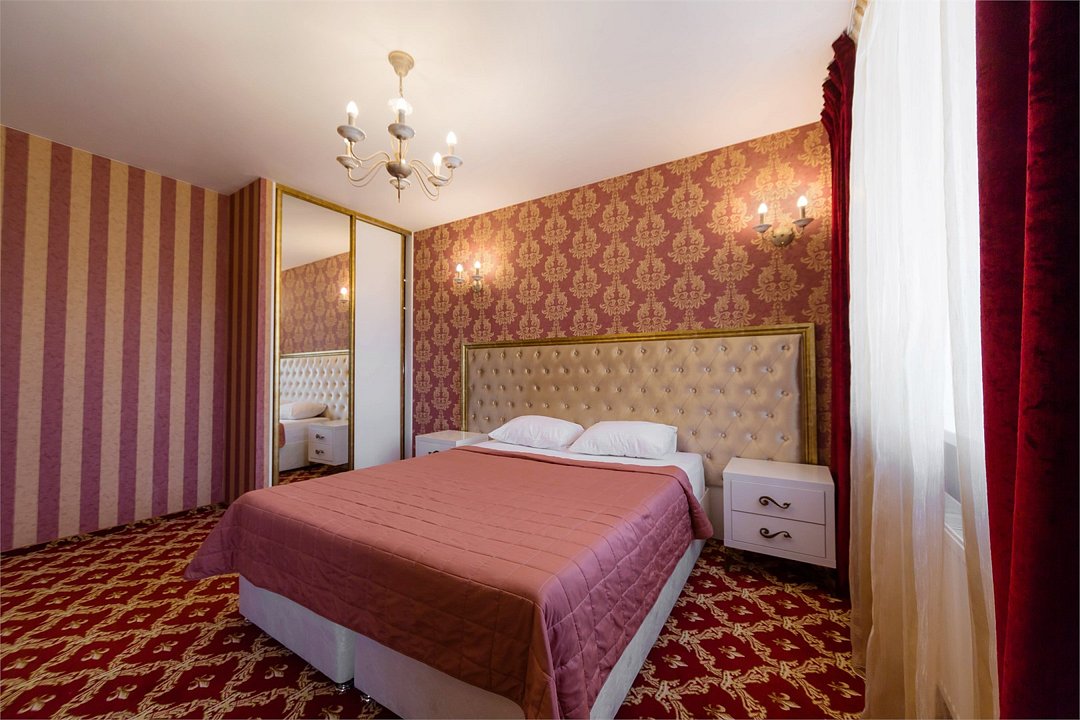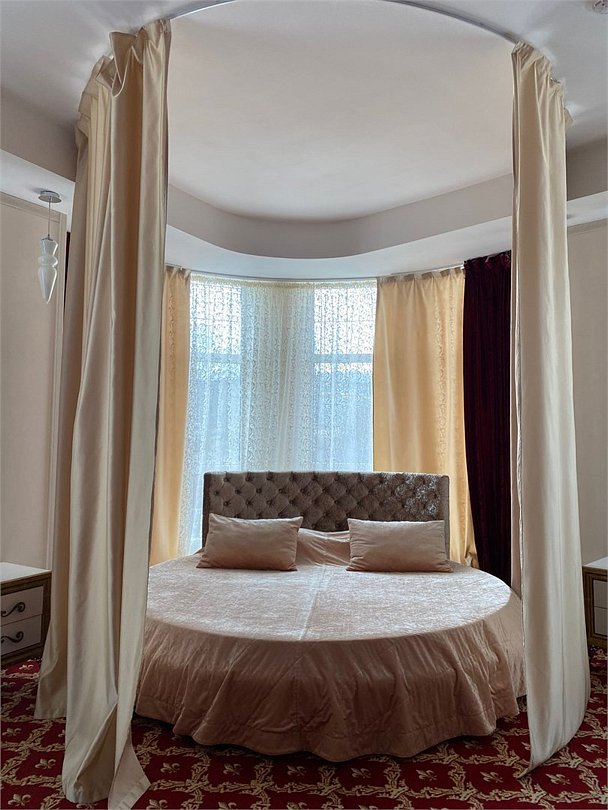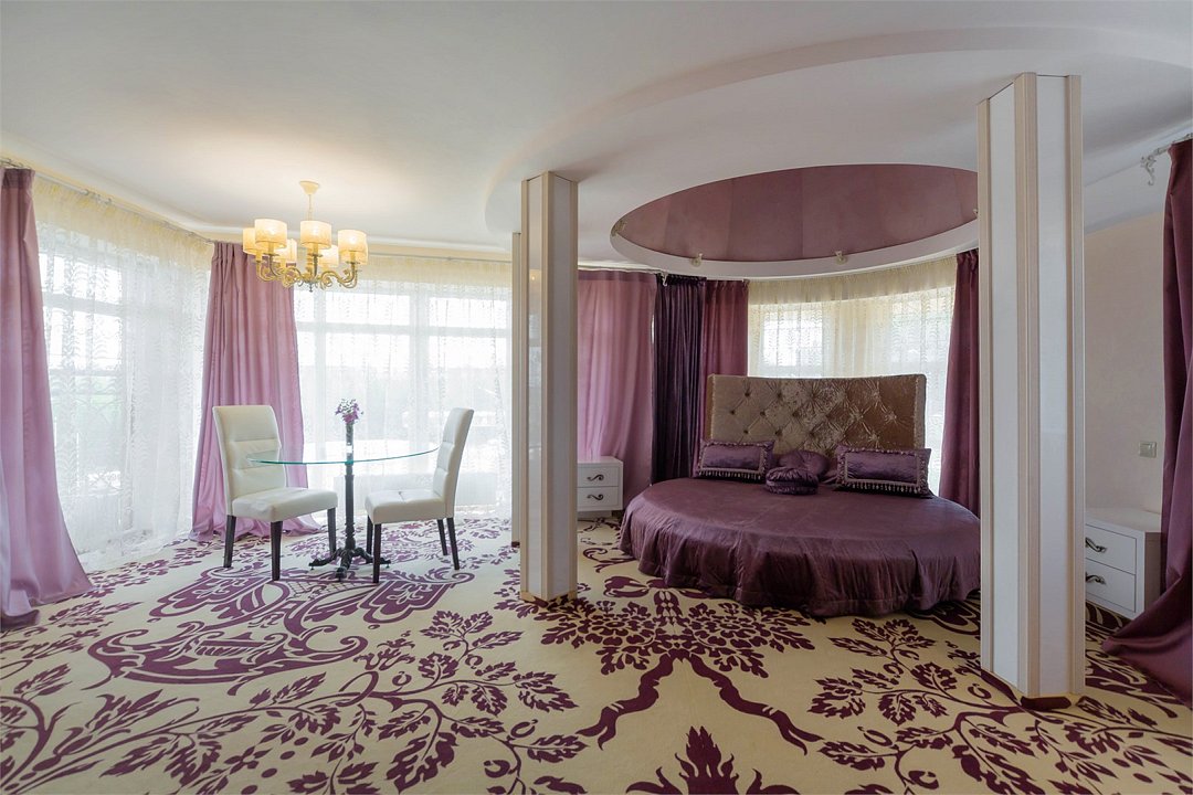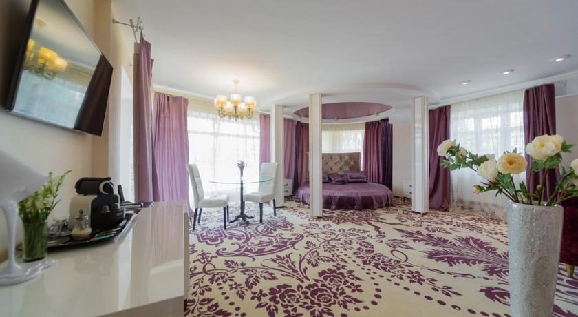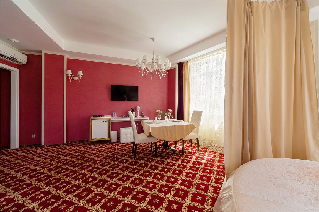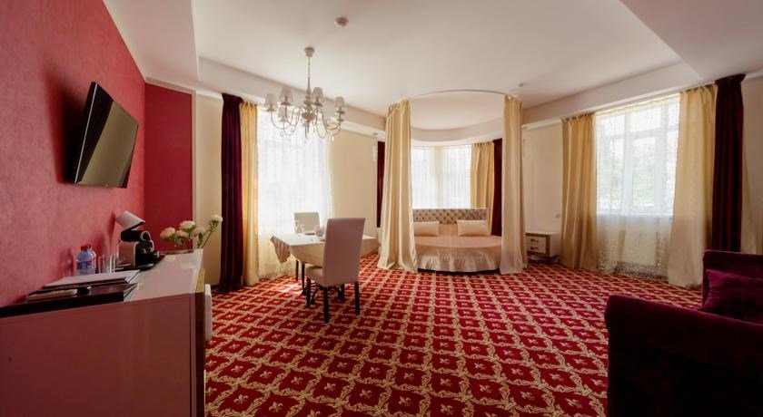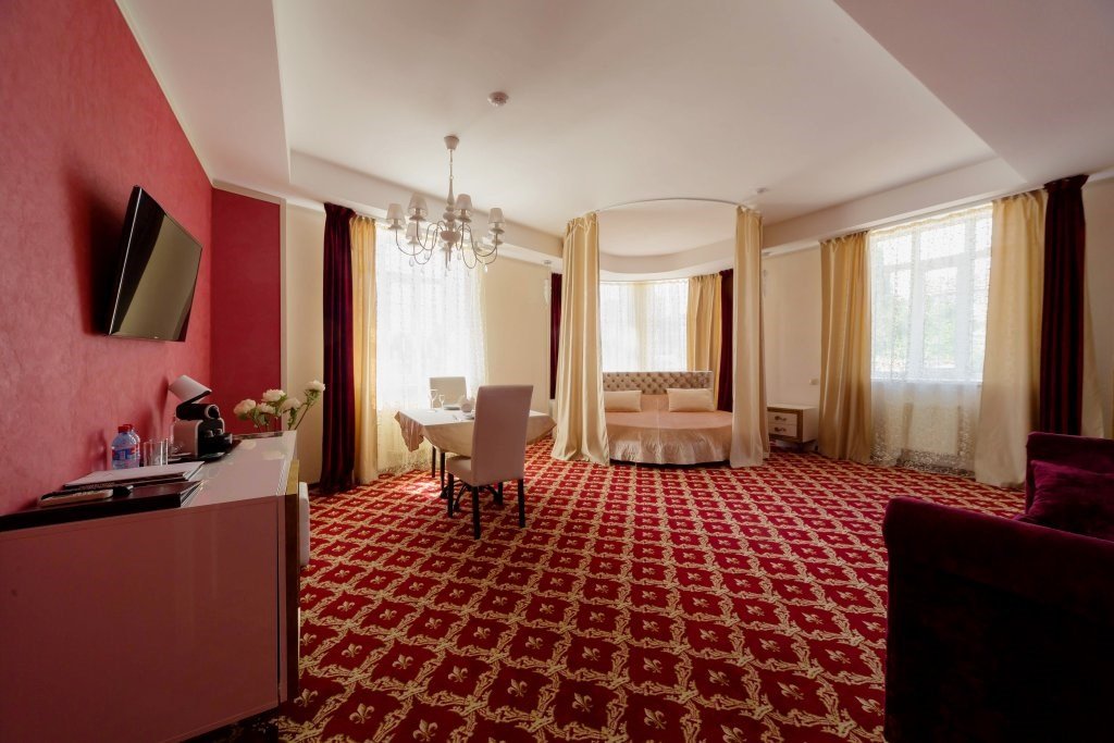 «Люкс Гранд» - Дизайнерский интерьер специально создан для тех, кто ищет романтики. Настоящей изюминкой номера является круглая кровать королевских размеров с классическим балдахином. Убранство комнаты дополняет роскошный диван с нежной бархатной обивкой, на котором можно удобно расположиться перед большим телевизором. Этот номер отлично подойдет для уединенных встреч или первой брачной ночи. Романтики добавит прекрасный вид на город, который открывается сквозь панорамные окна. Сервированный обеденный стол позволит заказать праздничный ужин или с комфортом позавтракать в номере.Услуги и удобства
