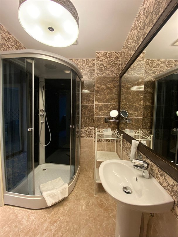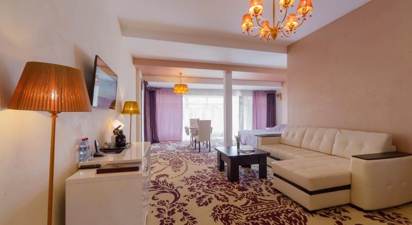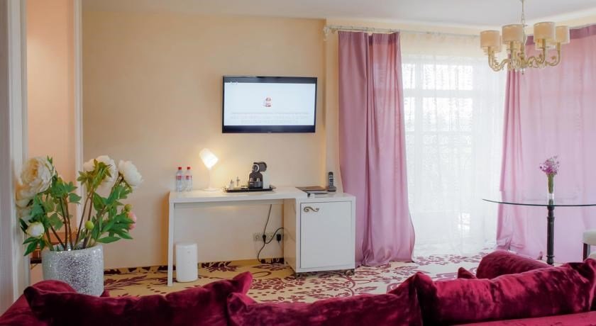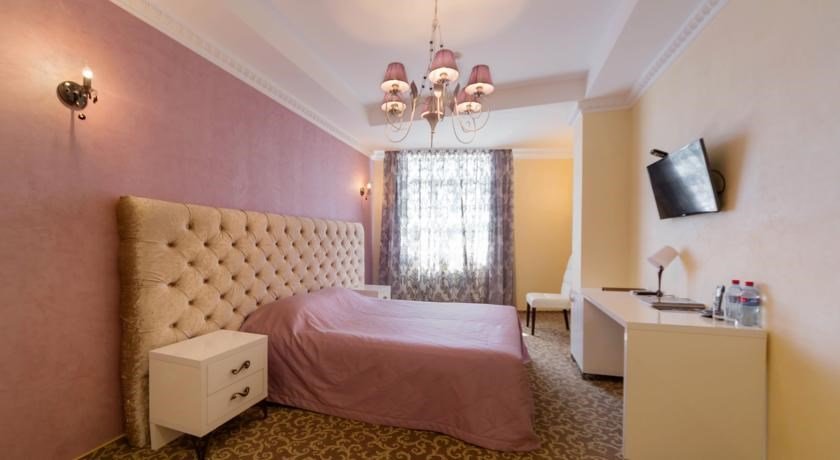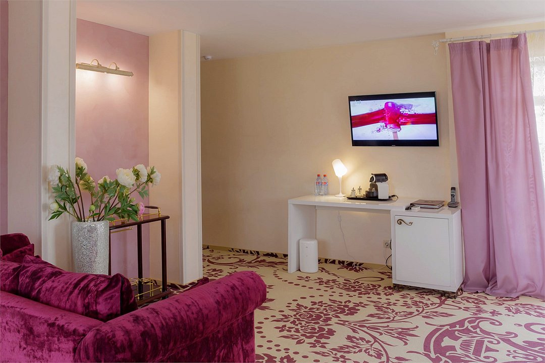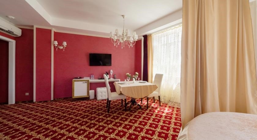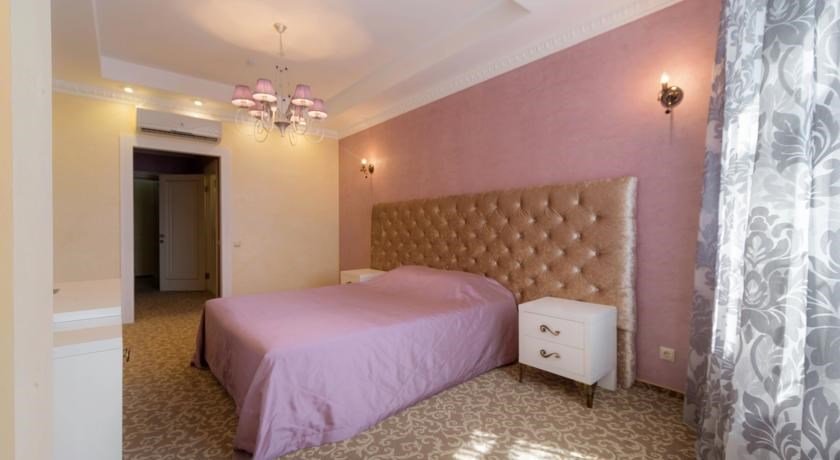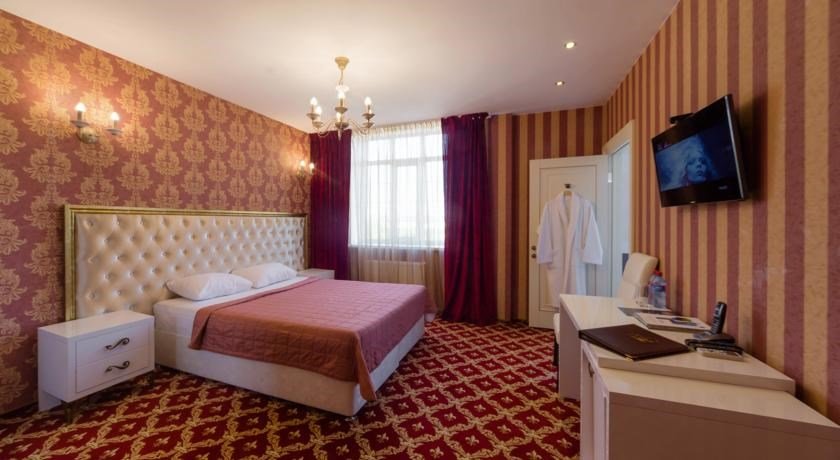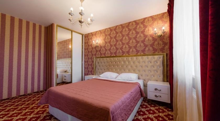 «Люкс Гранд» - Дизайнерский интерьер специально создан для тех, кто ищет романтики. Настоящей изюминкой номера является круглая кровать королевских размеров с классическим балдахином. Убранство комнаты дополняет роскошный диван с нежной бархатной обивкой, на котором можно удобно расположиться перед большим телевизором. Этот номер отлично подойдет для уединенных встреч или первой брачной ночи. Романтики добавит прекрасный вид на город, который открывается сквозь панорамные окна. Сервированный обеденный стол позволит заказать праздничный ужин или с комфортом позавтракать в номере.Услуги и удобства