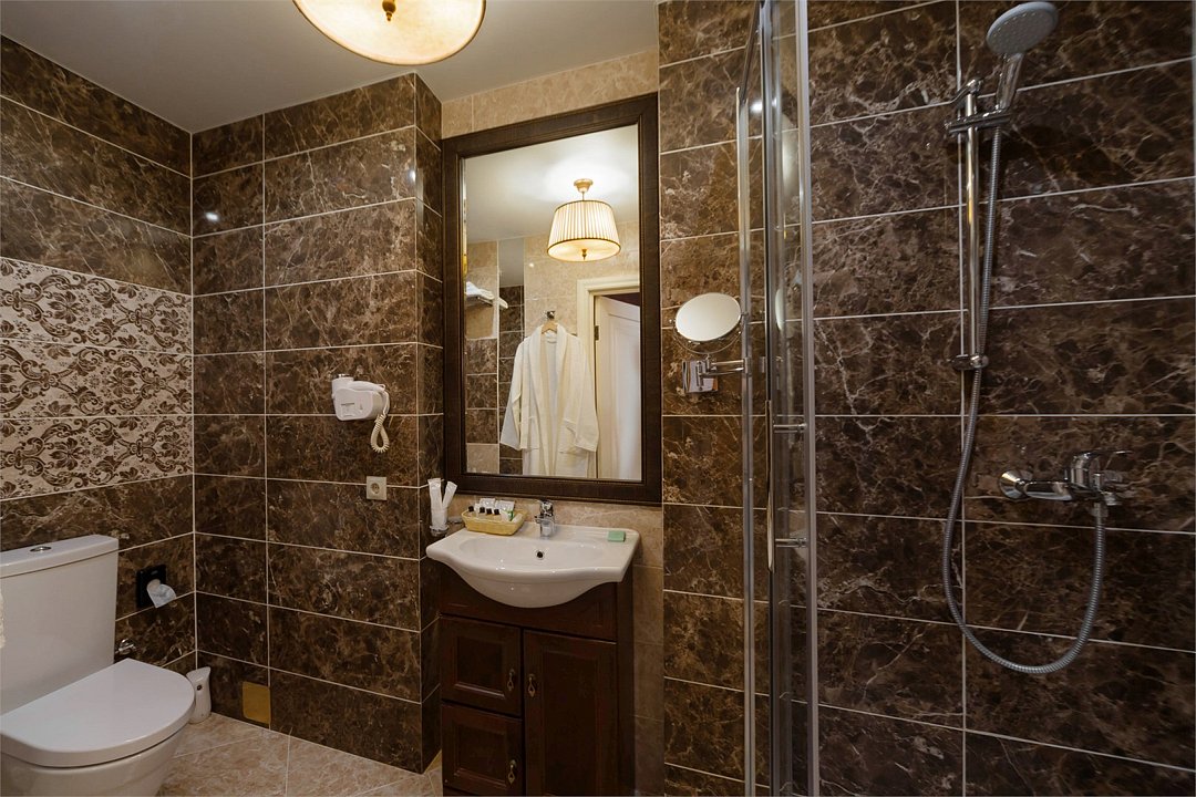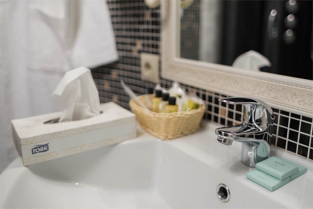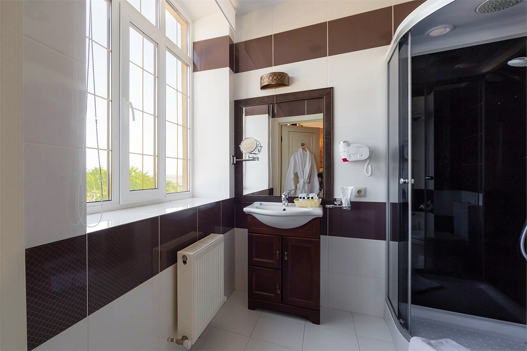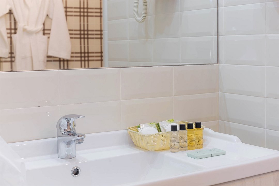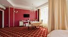 Номера категории «Премьер» станут прекрасным местом отдыха для тех, кто ценит комфорт. Лаконичный классический интерьер здесь прекрасно сочетается с практичностью обстановки. Вас порадует большая кровать размером 180х200 см, вместительная встроенная гардеробная в коридоре, качественная импортная сантехника в ванной комнате, большой телевизор и бесплатный интернет, мини-бар и включенный в стоимость завтрак. Номер «Премьер» - отличное решение для тех, кто любит простор (площадь комнаты 22 м²), удобство и красоту.Услуги и удобства
