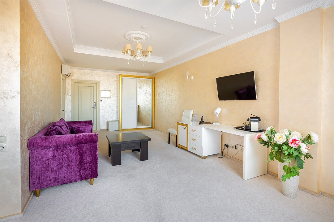 телевизор, спутниковое телевидение, Wi-Fi, интернет, телефон, кондиционер, система климат-контроля, светильник, настольные лампы, фен, система безопасности, электронные замки, ванная комната, душевая кабина, биде, банные принадлежности, халаты, банные полотенца, тапочки, гигиенические средства, косметические средства, кровать «King size», двуспальная кровать, диван, тумбы, стулья, шкаф для одежды, гардеробная, вешалки, письменный стол, зеркало, мини-бар, письменные принадлежности, чайный набор, обслуживание номеров, информационная карта, меню, чайник, унитаз, раковина, косметическое зеркало, питьевая вода, ковровое покрытие, отопление, душ, вид на город, стаканы, стул, туалетные средства, сплит-система, внутренний телефон, мини-холодильник, шкаф-купе, номер для некурящих, без питомцевВ номере