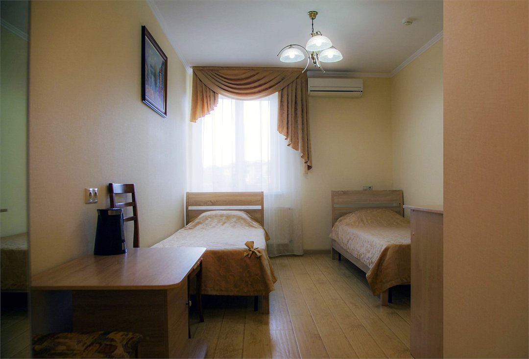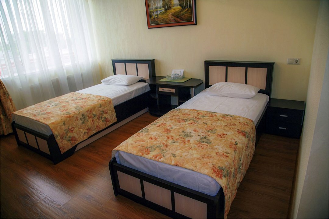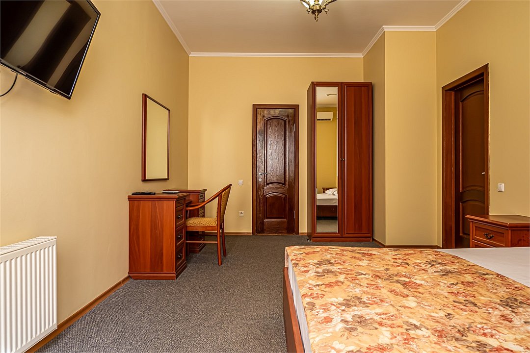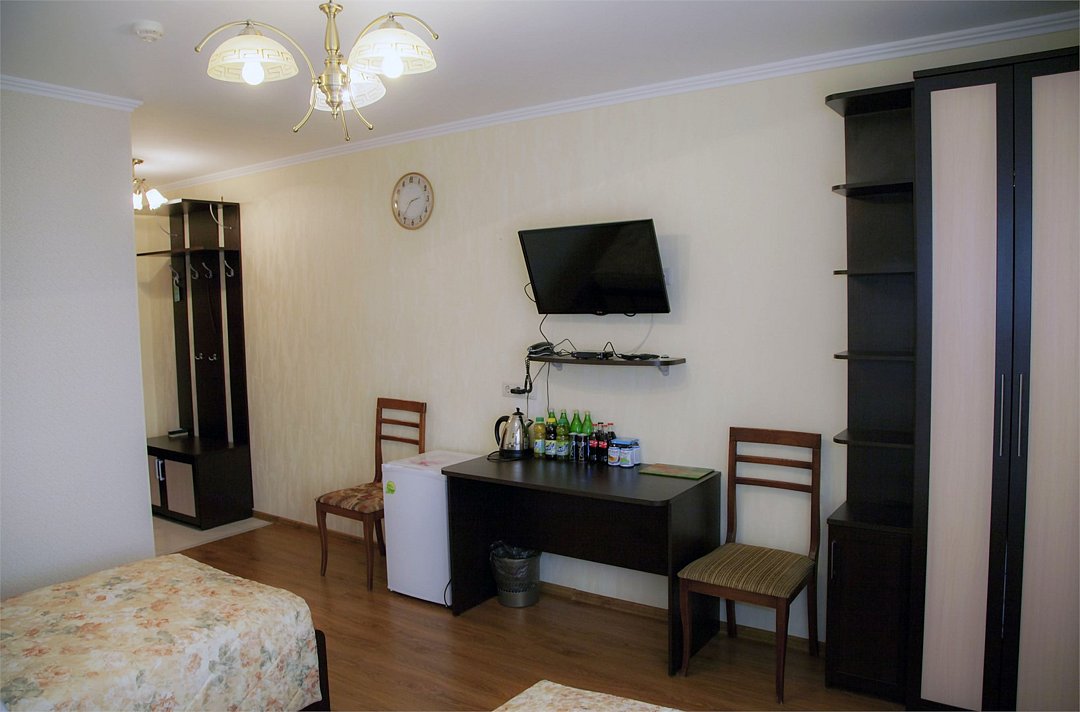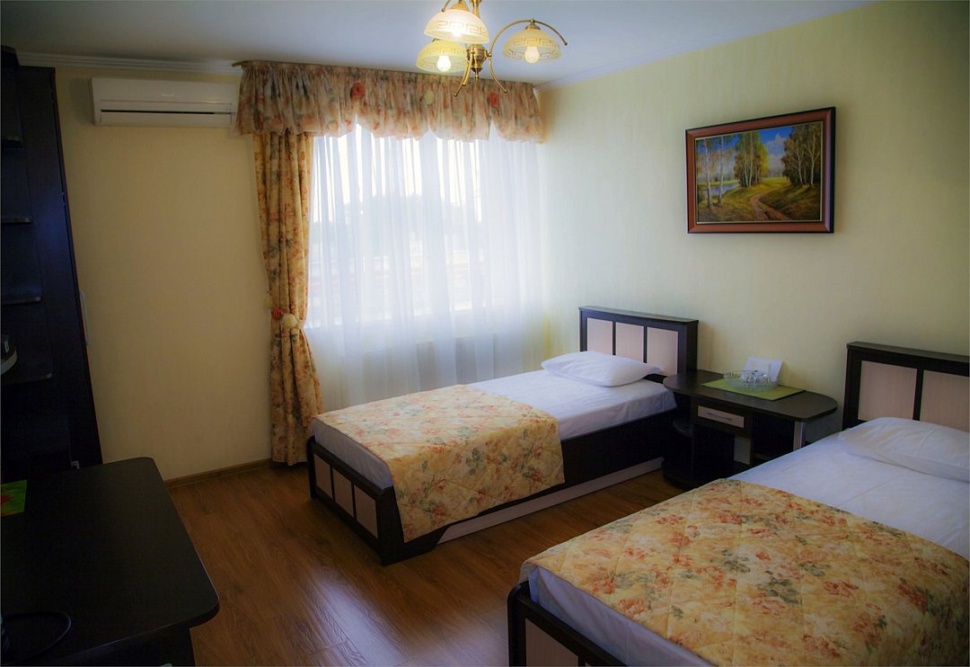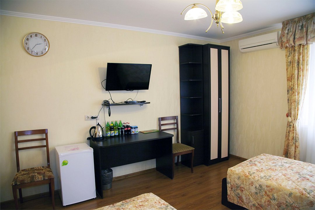 телевизор, спутниковое телевидение, кабельное телевидение, Wi-Fi, интернет, холодильник, кондиционер, фен, утюг, ванная комната, ванна или душевая кабина, халаты, тапочки, косметические средства, две полутораспальные кровати, стулья, гардеробная, вешалки, чайник, унитаз, душ, вид на город, стол, туалетные средства, санузел на этаже, туалет, сплит-система, внутренний телефон, мини-холодильник, москитная сетка, без окна, мансардные окна, рабочий стол, холодильный шкаф, услуги прачечной (платно), туалетные принадлежности премиум-класса, частный двор, комната для переговоров (за дополнительную плату), можно с питомцамиВ номере
