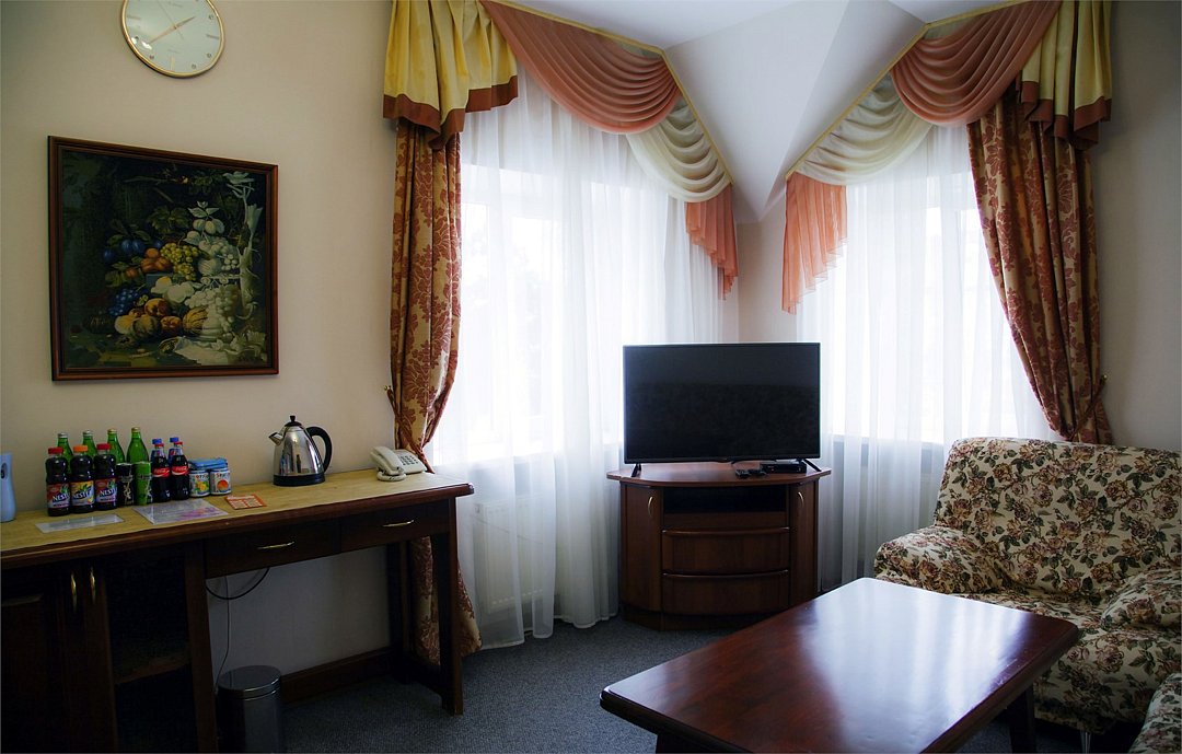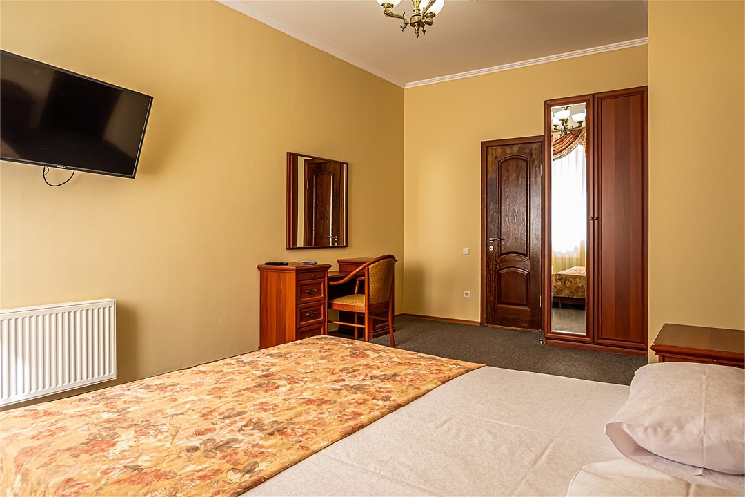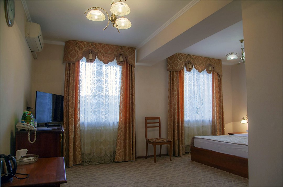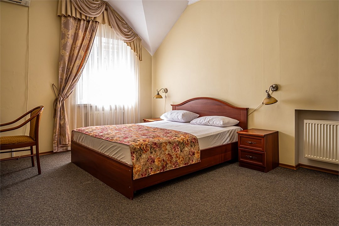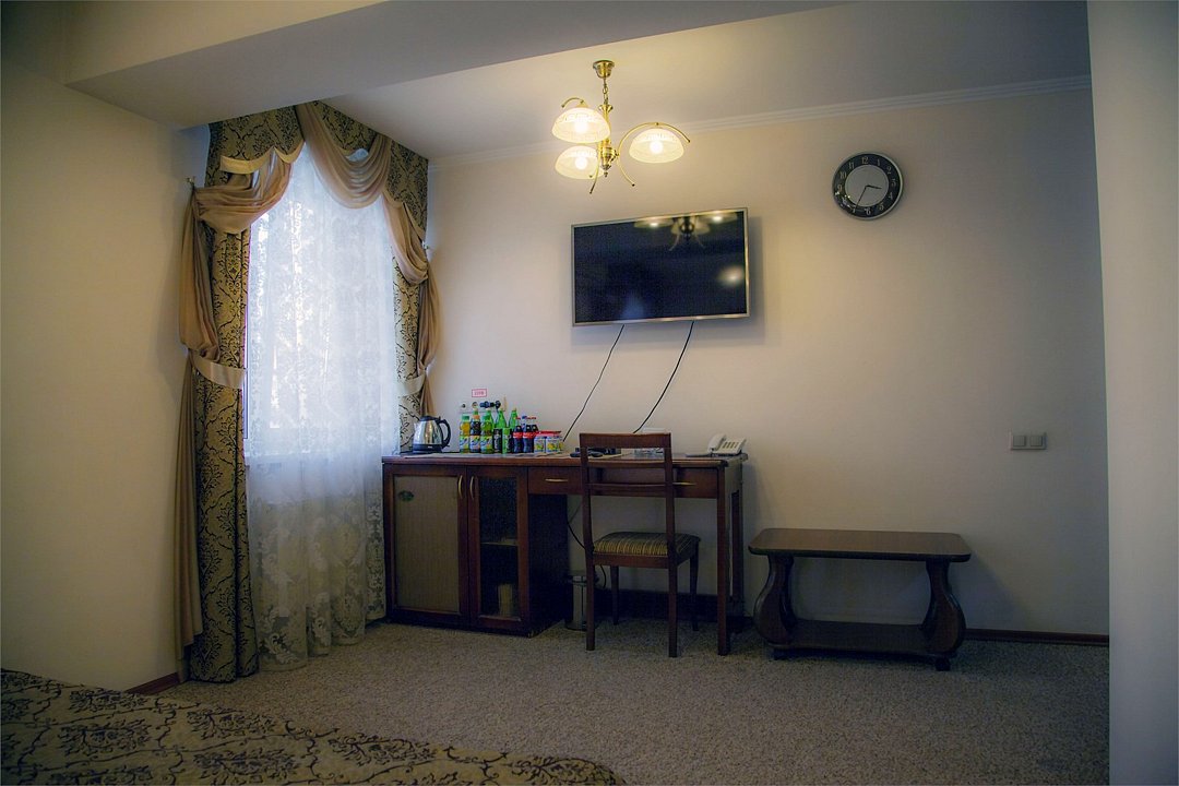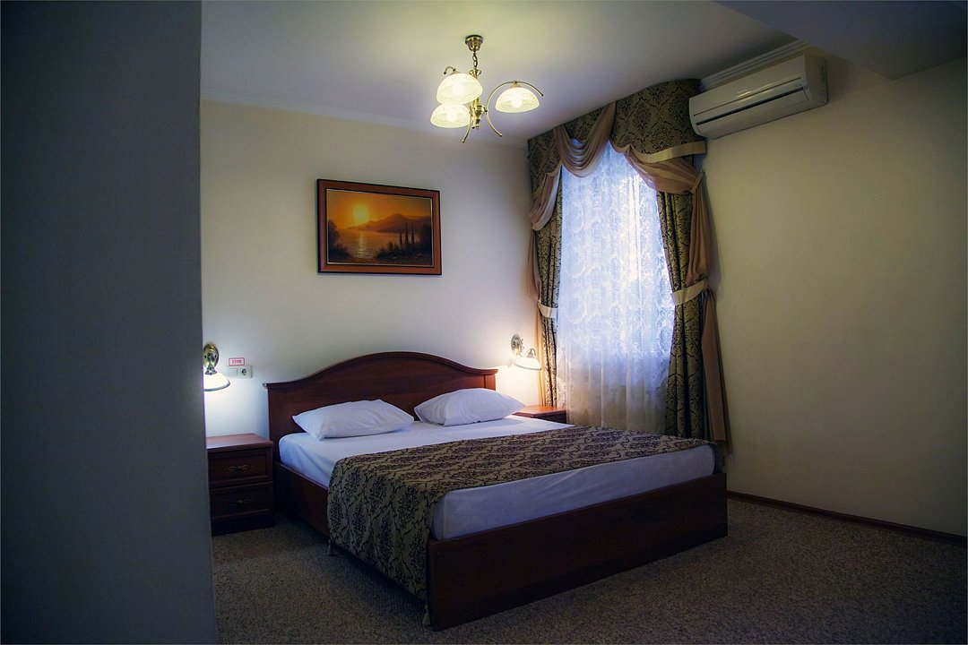 телевизор, спутниковое телевидение, кабельное телевидение, Wi-Fi, интернет, холодильник, кондиционер, фен, утюг, ванная комната, ванна или душевая кабина, халаты, тапочки, косметические средства, две полутораспальные кровати, стулья, гардеробная, вешалки, чайник, унитаз, душ, вид на город, стол, туалетные средства, санузел на этаже, туалет, сплит-система, внутренний телефон, мини-холодильник, москитная сетка, без окна, мансардные окна, рабочий стол, холодильный шкаф, услуги прачечной (платно), туалетные принадлежности премиум-класса, частный двор, комната для переговоров (за дополнительную плату), можно с питомцамиВ номере