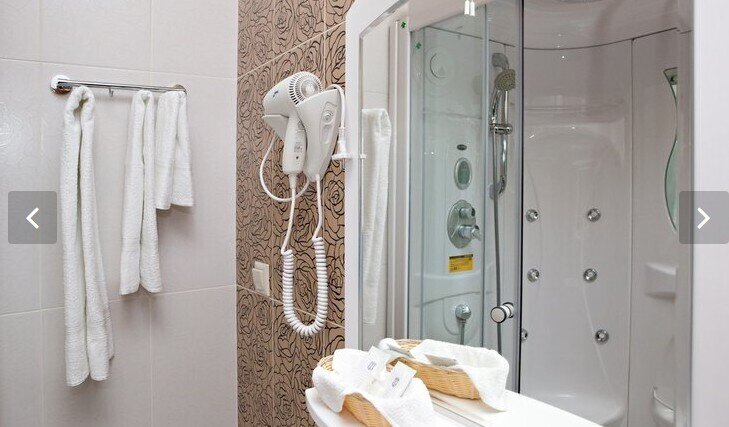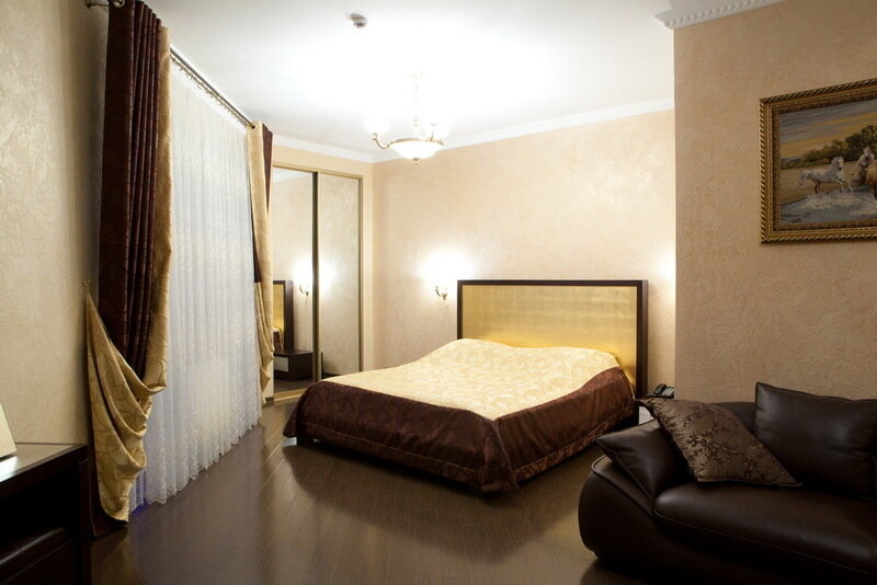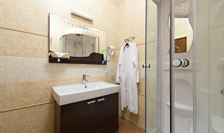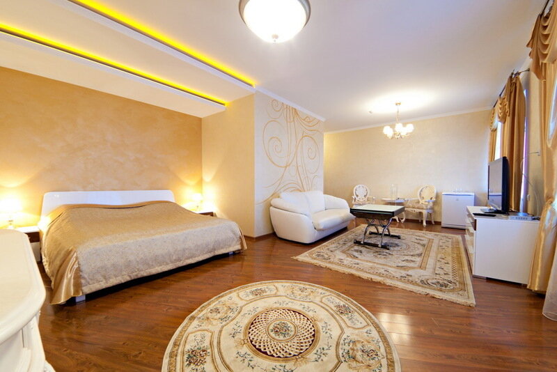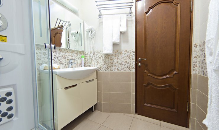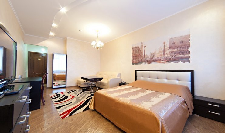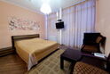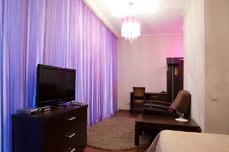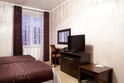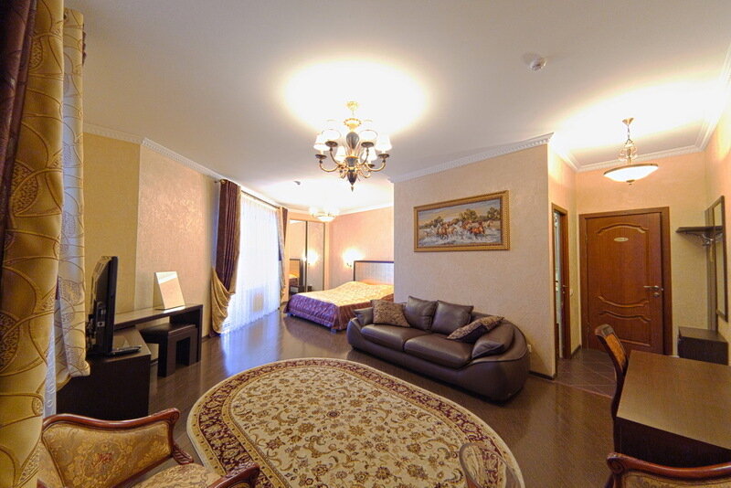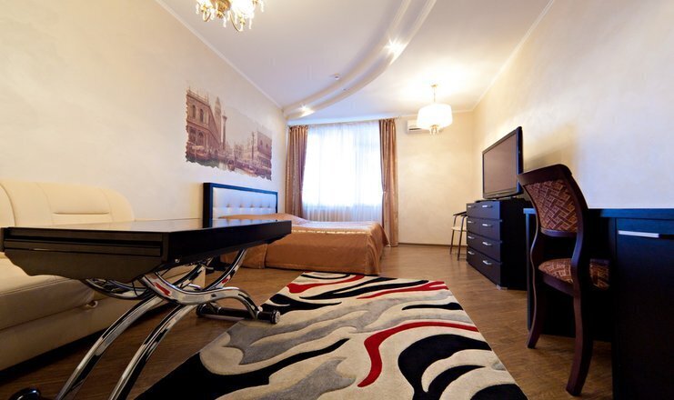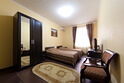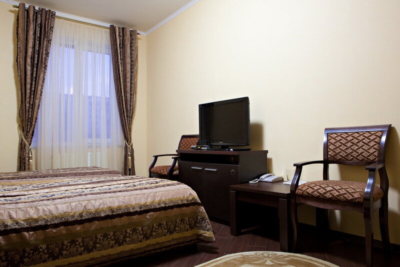 В номере кровать (160х200), прикроватные тумбочки, плательный шкаф, журнальный столик, одно кресло, зеркало, письменный стол, комод, ванная комната оборудованная душевой кабиной умывальником и туалетом, телевизор со спутниковым тв, бесплатный WiFi, кондиционер, холодильник, городской телефон, завтрак включен в стоимость номера.