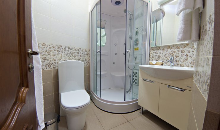 Ванная комната оборудованная душевой кабиной, умывальником, туалетом и биде.