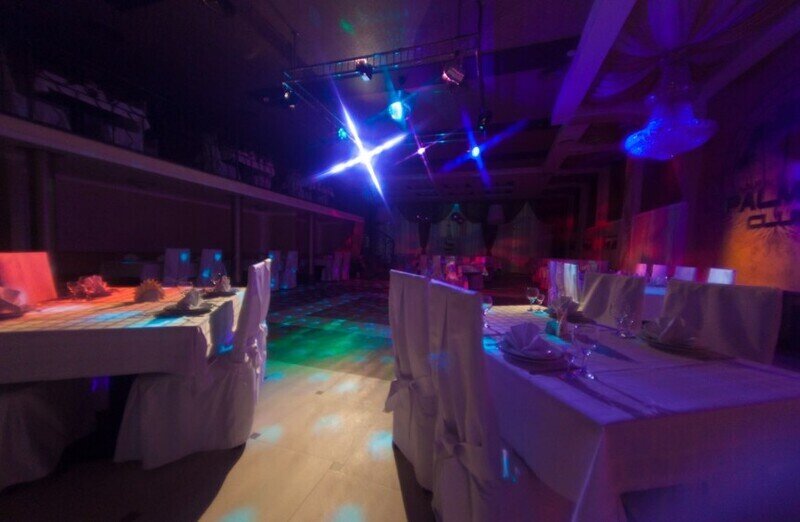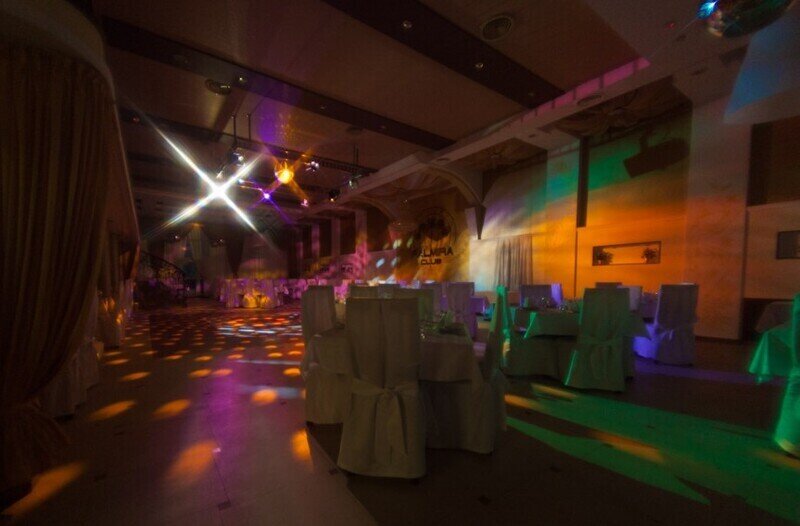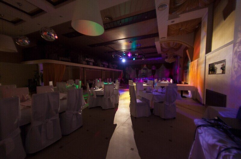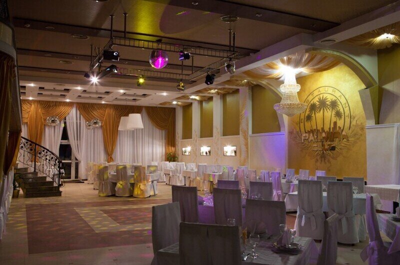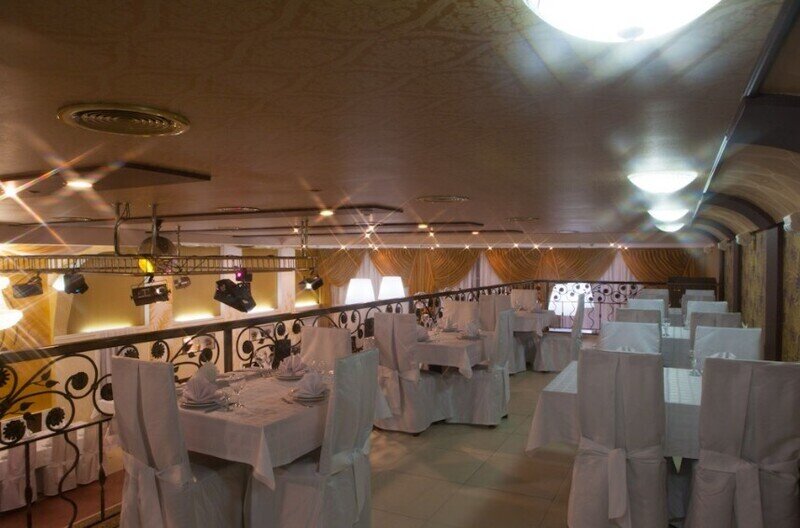Отделка зала — золотисто-светлая, а при проведении праздников он может быть белоснежным из-за специальных накидок на кресла и скатертей.