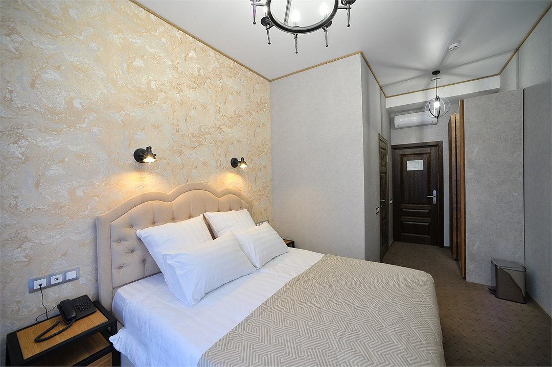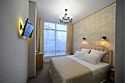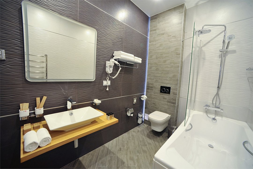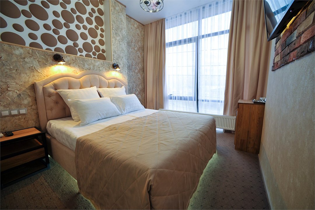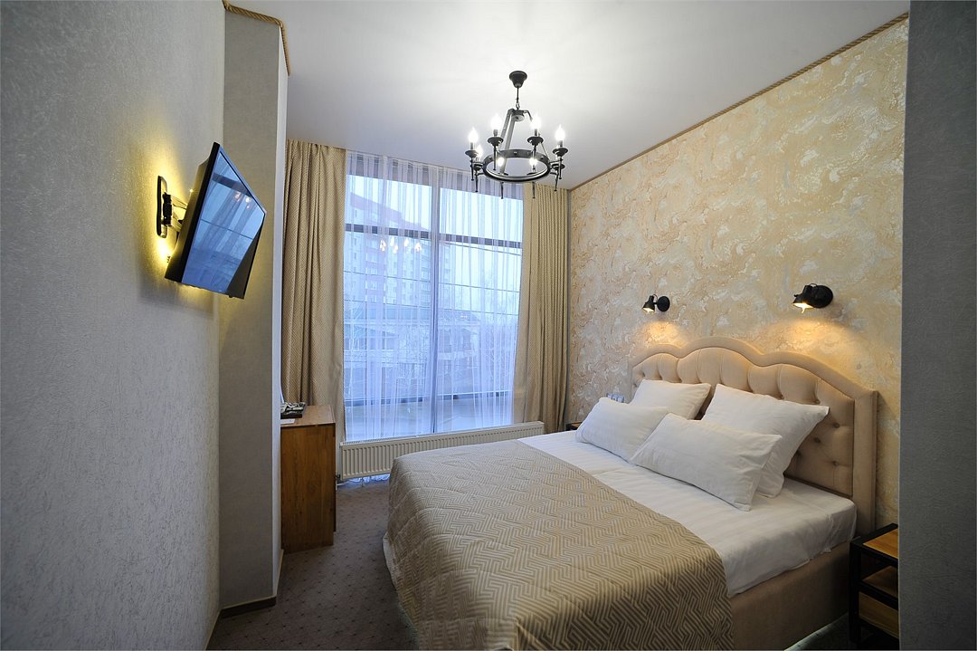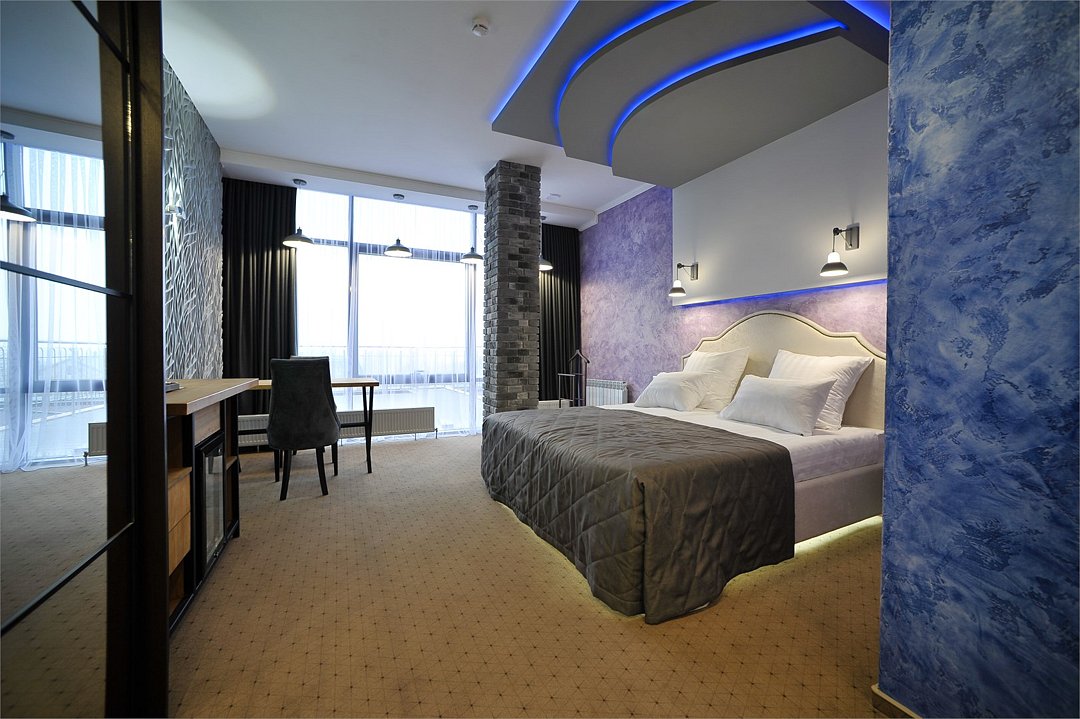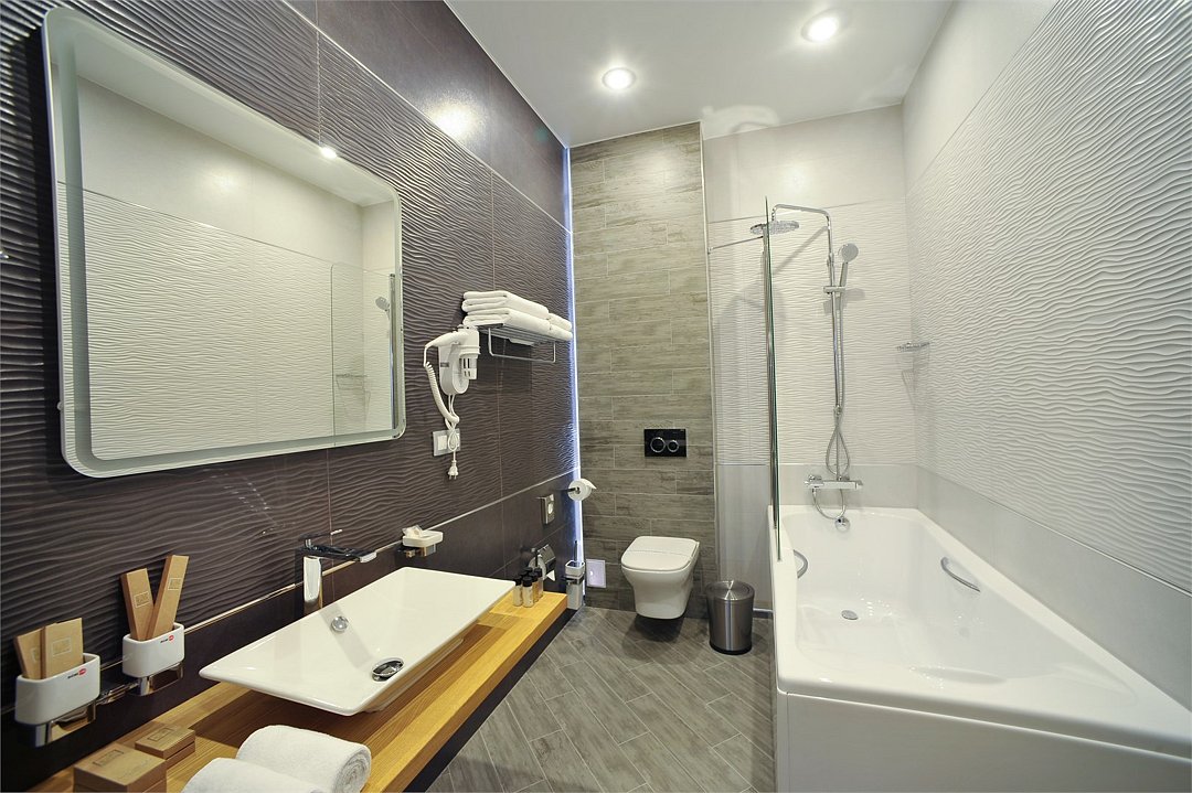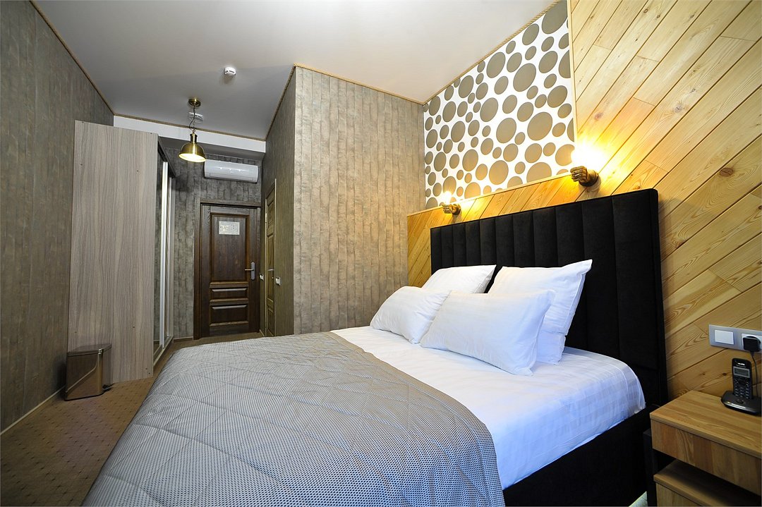 Улучшенный номер стандарт оснащен двухспальной кроватью king-size, плазменным телевизором, кондиционером, большим шкафом-купе, подсветка в комнате и ванной, душ, два халата, полотенца, тапочки, душевые принадлежности, одноразовые наборы(зубная щетка, расческа, бритвенный и косметический набор, шапочка для душа), так же в номере имеется фен, чайник и мини-бар с напитками и легкими закусками.Услуги и удобства