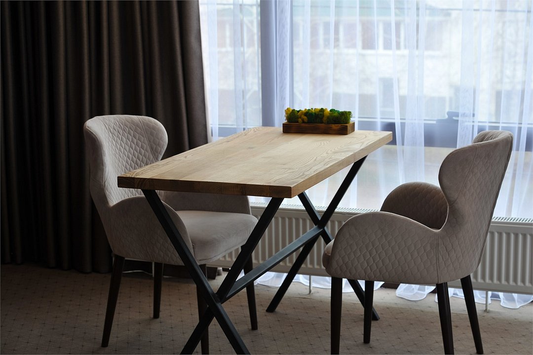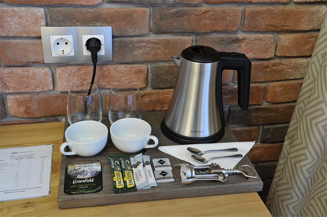 музыкальный центр, Wi-Fi, кондиционер, фен, кофемашина, утюг, ванная комната, ванна, банные принадлежности, халаты, банные полотенца, тапочки, косметические средства, терраса, кровать «King size», гладильная доска, вешалки, обеденный стол, зеркало, мини-бар, чайный набор, обслуживание номеров, сейф, питьевая вода, обеденная зона, кулер на этаже, вид во двор, туалетные средства, туалет, раскладной диван, мини-холодильник, шкаф-купе, телевизор со Smart TV, номер для некурящих, без питомцевВ номере