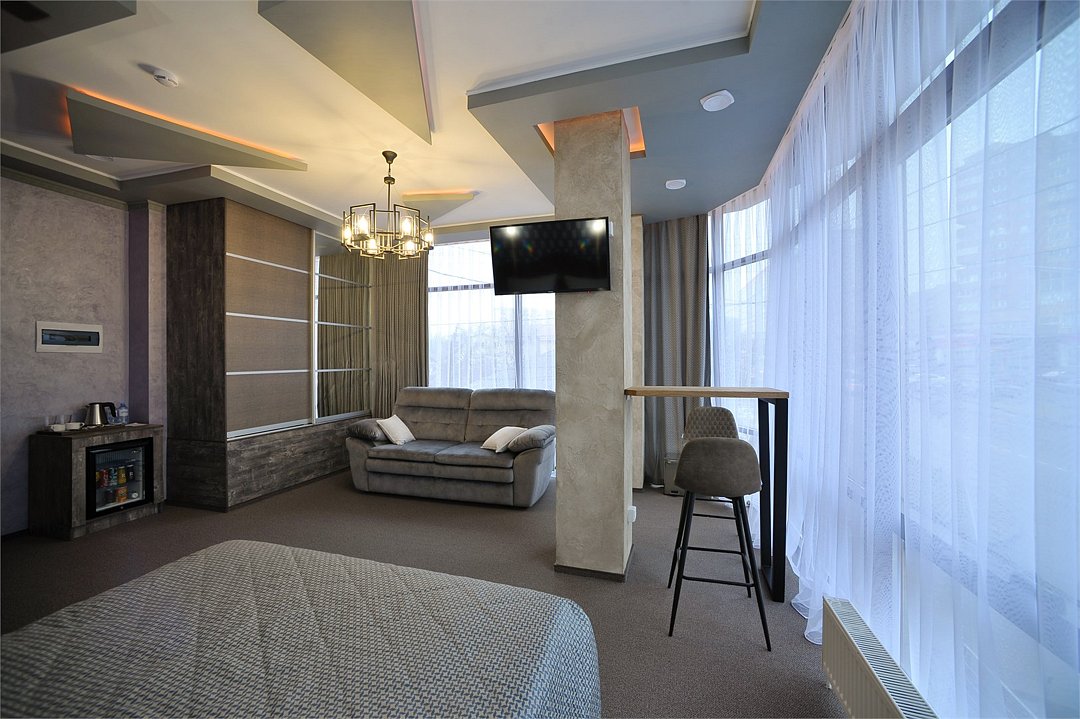 Кровать размера king-size, большой диван, обеденный столик с двумя стульями, плазменный телевизор, кондиционер, большой шкаф-купе, подсветка в комнате и ванной, ванна, два халата, комплект полотенец, душевые принадлежности, одноразовые наборы, тапочки, фен, чайник, кофемашина, музыкальная колонка jbl, мини-бар с напитками и легкими закусками.Услуги и удобства