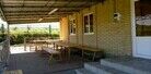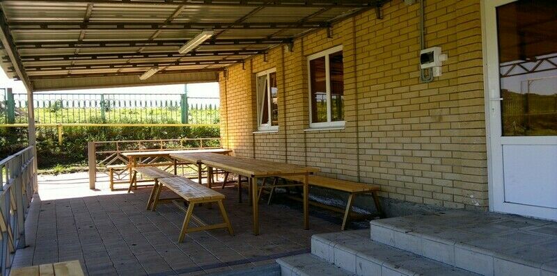 На базе есть два типа домиков - деревянные срубы и новые кирпичные домики, но у каждого домика есть или застекленная веранда или открытая терраса. Недалеко от каждого домика находится свой мангал и столы, а в целом на территории оборудованы две отдельностоящие мангальные группы.
