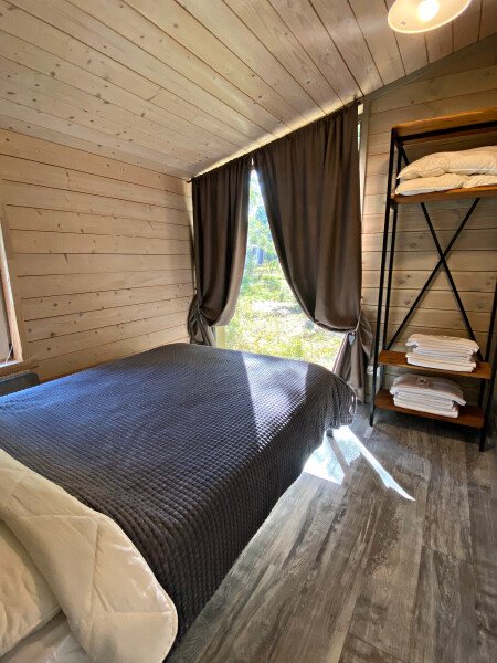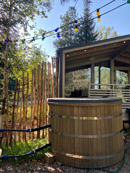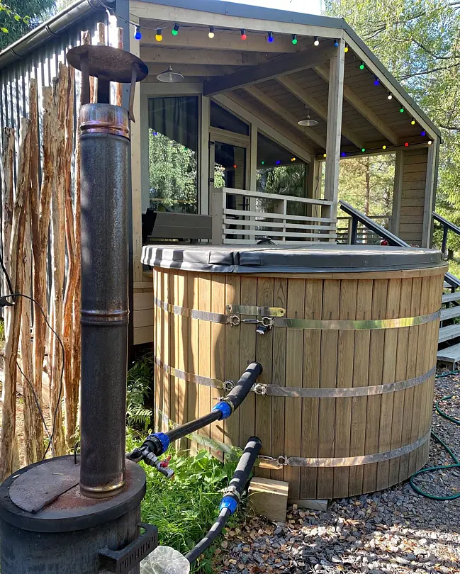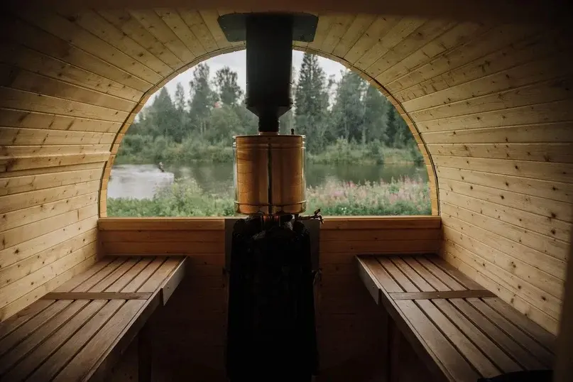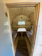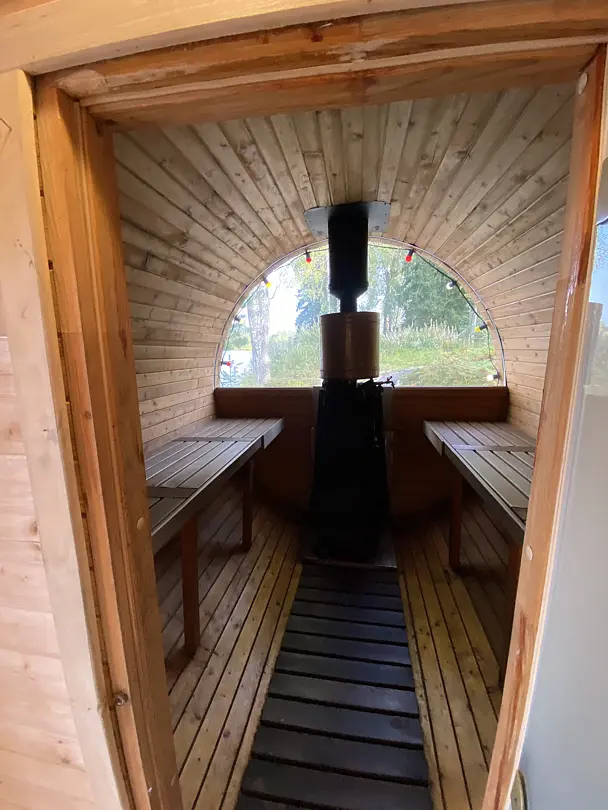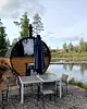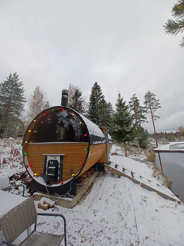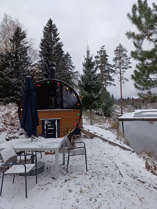 Компактная баня-бочка на дровах для небольших компаний до 6 человек. В комплект входит 6 банных килтов/полотенец. Питьевая вода из-под крана (скважина).
