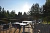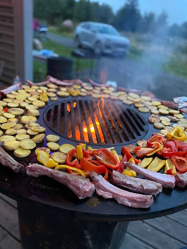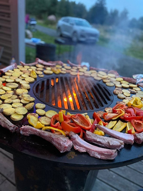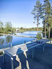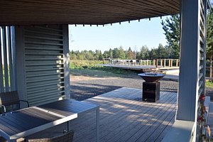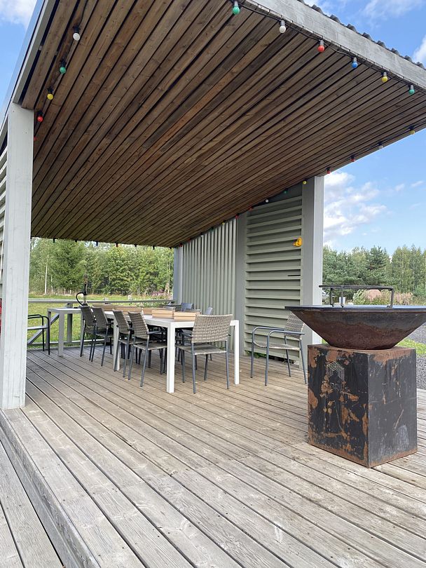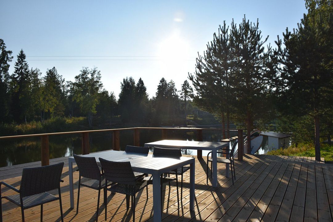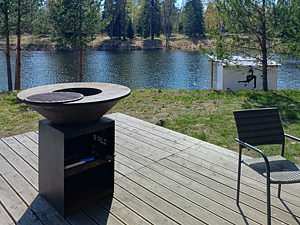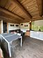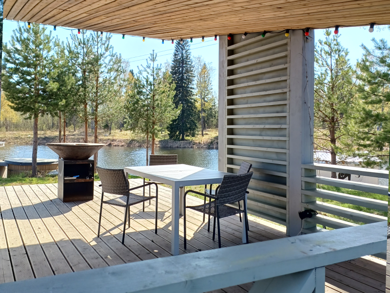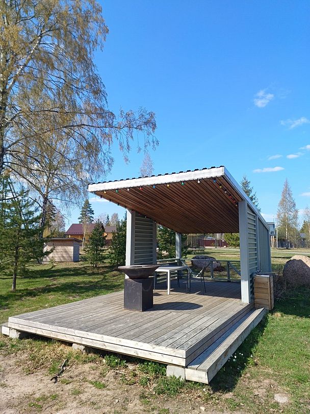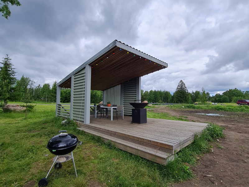 Беседка барбекю с дровяным грилем-очагом и видом на озеро рассчитана на компанию из 10−12 человек.
