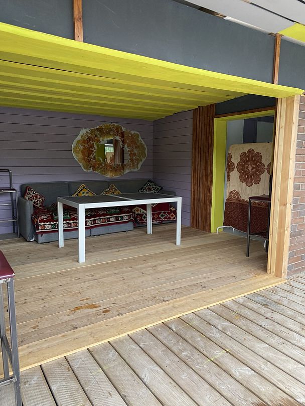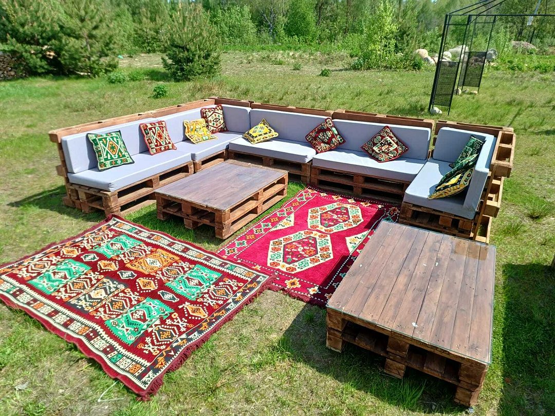 Входит: мебель из паллет— 2 стола, 5 диванных модуля. Сидушки, восточные ковры, подушки.