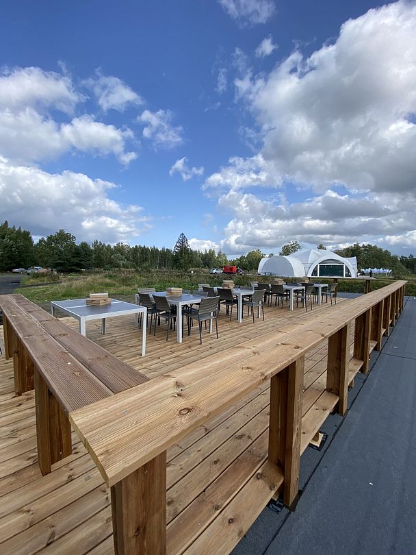 Расположена на живописной террасе над вейк-станцией. Столы, стулья и переносная модульная диванная зона прилагаются.
