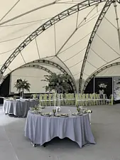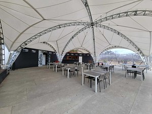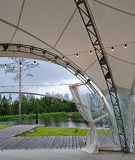 Шатер для мероприятий у озера. Двухуровневая терраса со спуском к воде.