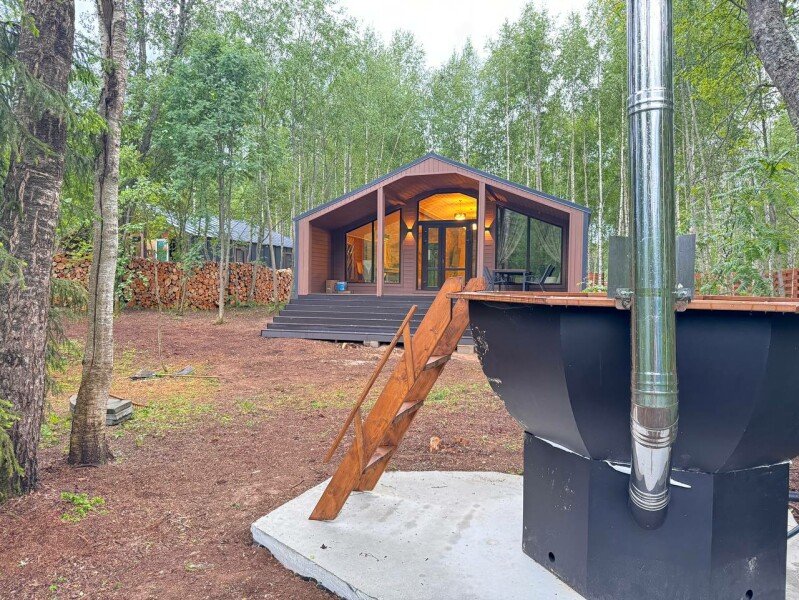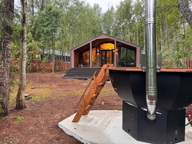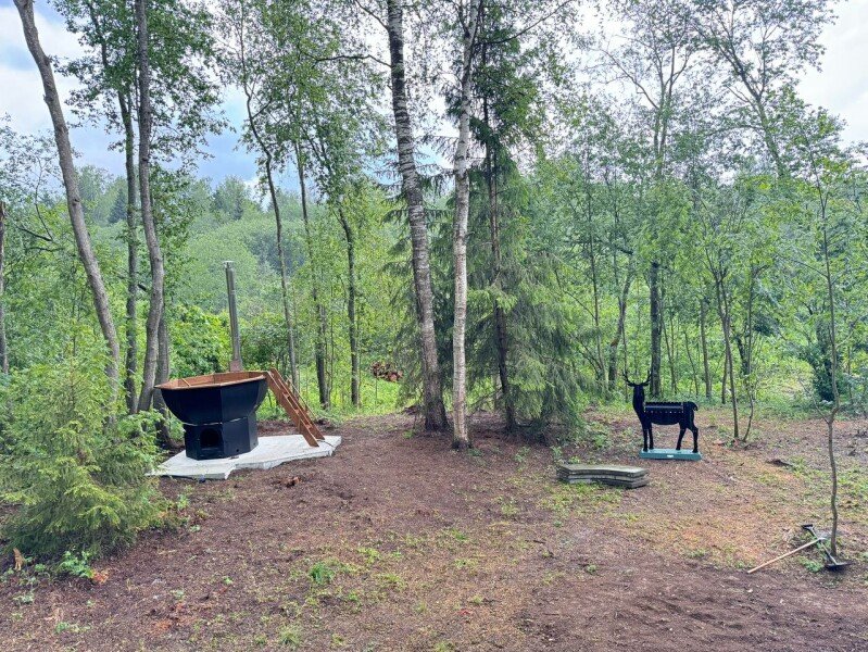 Перед домом есть костровая зона с мангалом и креслами-шезлонгами. Здесь вы можете расслабиться в банном чане или приготовить свою любимую еду на костре, наслаждаясь нетронутой природой. В доме установлен проектор.