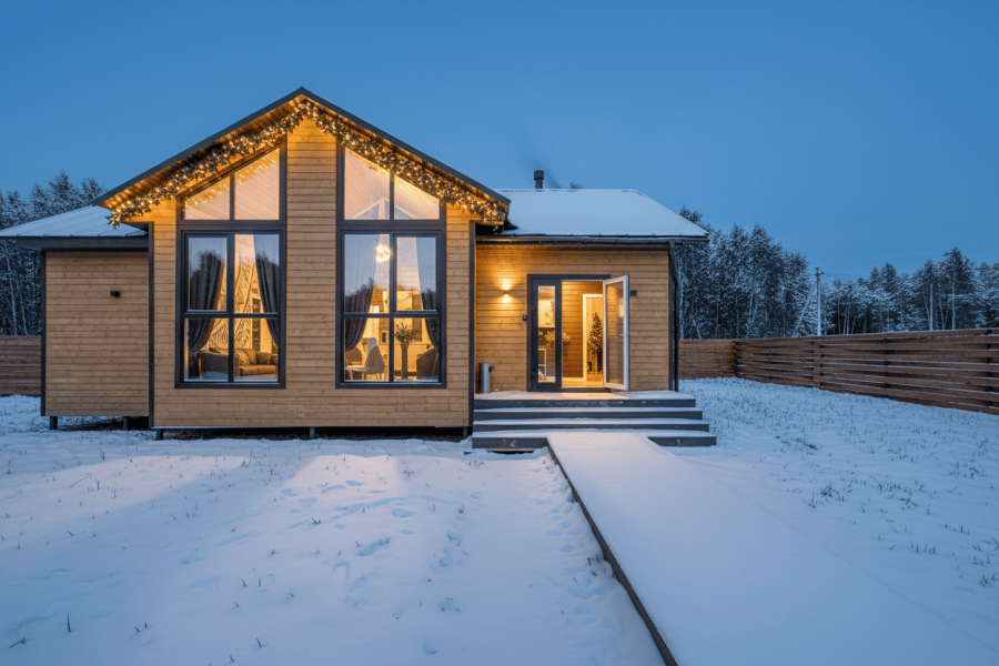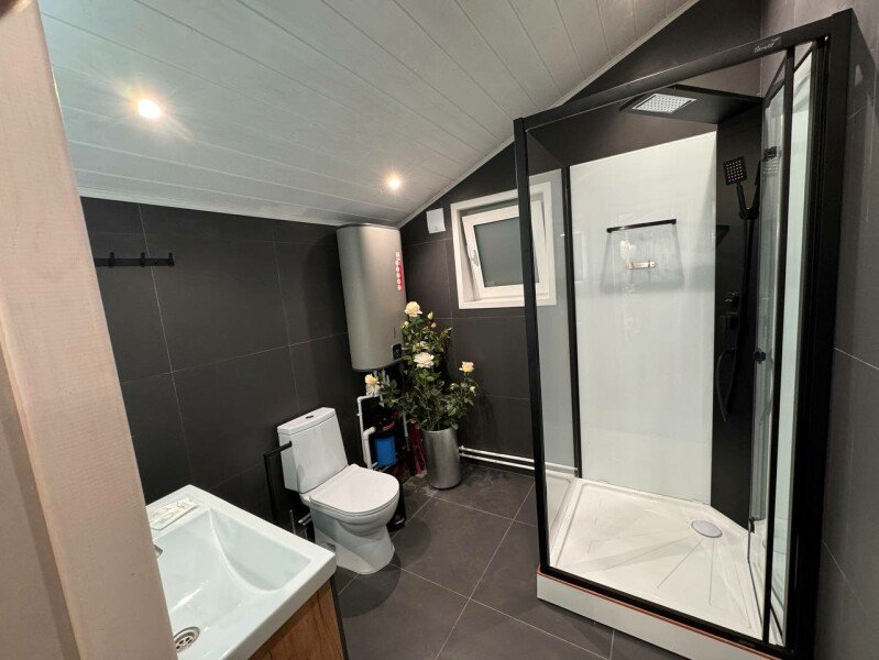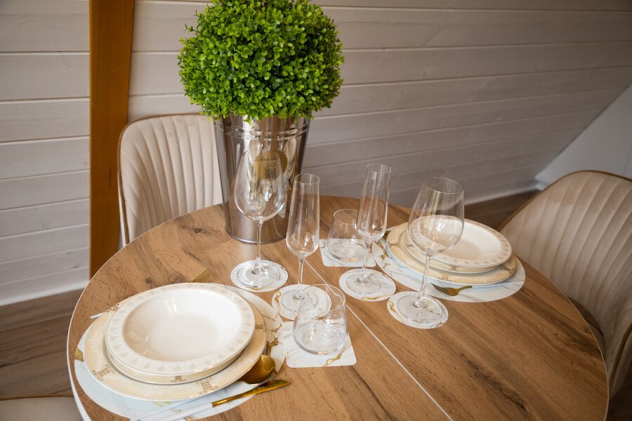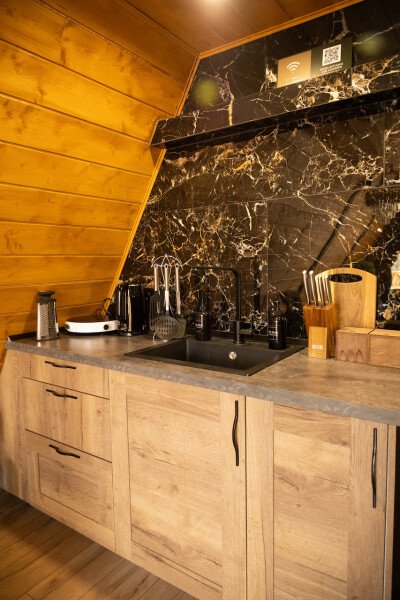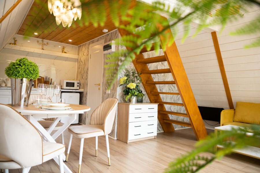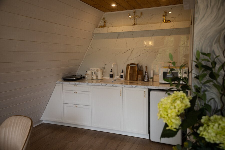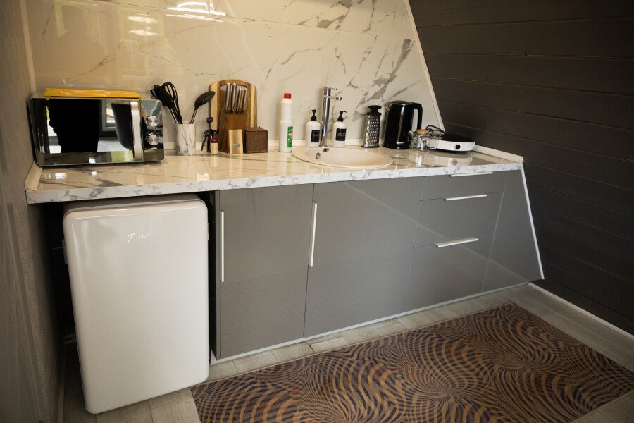 Внутри дома есть все необходимое для комфортного проживания: кухня, оборудованная всем необходимым, ванная комната с душевой кабиной и санузлом, обеденный стол и уютный диван, где всегда можно провести время за просмотром любимого фильма.