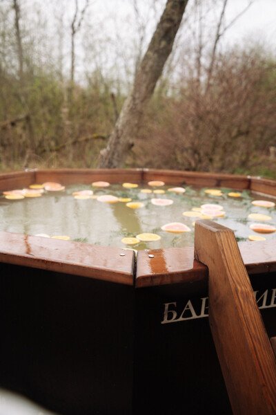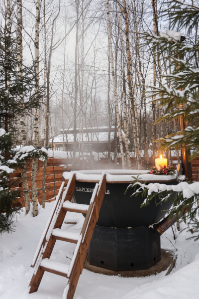 - сходить в баню и расслабиться в горячем чане, наполненном цитрусами и еловыми ветками (наполнение чана на выбор);