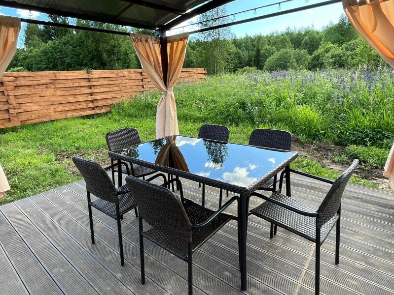 На террасе дома Вы можете расслабится в кресле, приготовить обед или ужин на мангале, а вечером погреться в горячем чане. В доме установлен проектор.