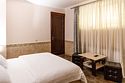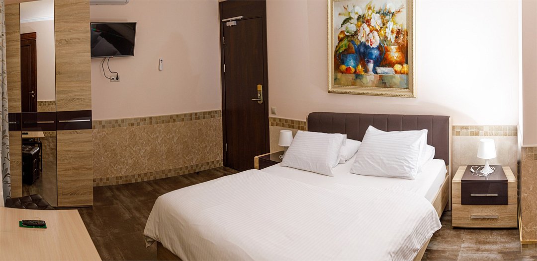 Стандартная комната с большой модульной двуспальной кроватью, которую можно разделить на два односпальных места. Так же в комнате есть телевизор, письменный стол, шкаф для одежды. Постельное белье из 100% хлопка. Предусмотрены варианты размещения с двумя раздельными кроватями, шириной 1.5 м. Дополнительные места для взрослых и детей старше 3-х лет, в данной категории комнат не предоставляются. Возможно размещение детей до 3-х лет в детской кроватке. В ванной комнате есть: биде, душевая кабина, раковина, унитаз, набор полотенец, гель для душа, шампунь.Услуги и удобства