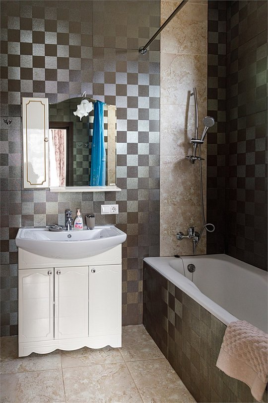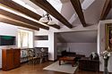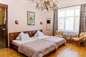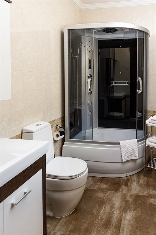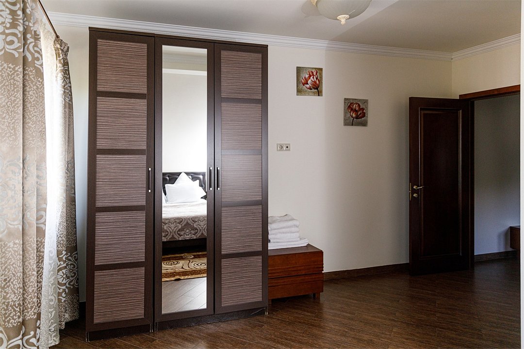Состоит из двух комнат: спальня и гостевая комната, общая площадь 50 м.кв Меблирован: шкафами, двуспальной кроватью, раскладным диваном, столом и мини-холодильником, двумя телевизорами, Wi-Fi, есть балкон. Ванная комната имеет вход из каждой комнаты. Оснащена ванной, биде, набором полотенец, гелем для душа, шампунем.Услуги и удобства