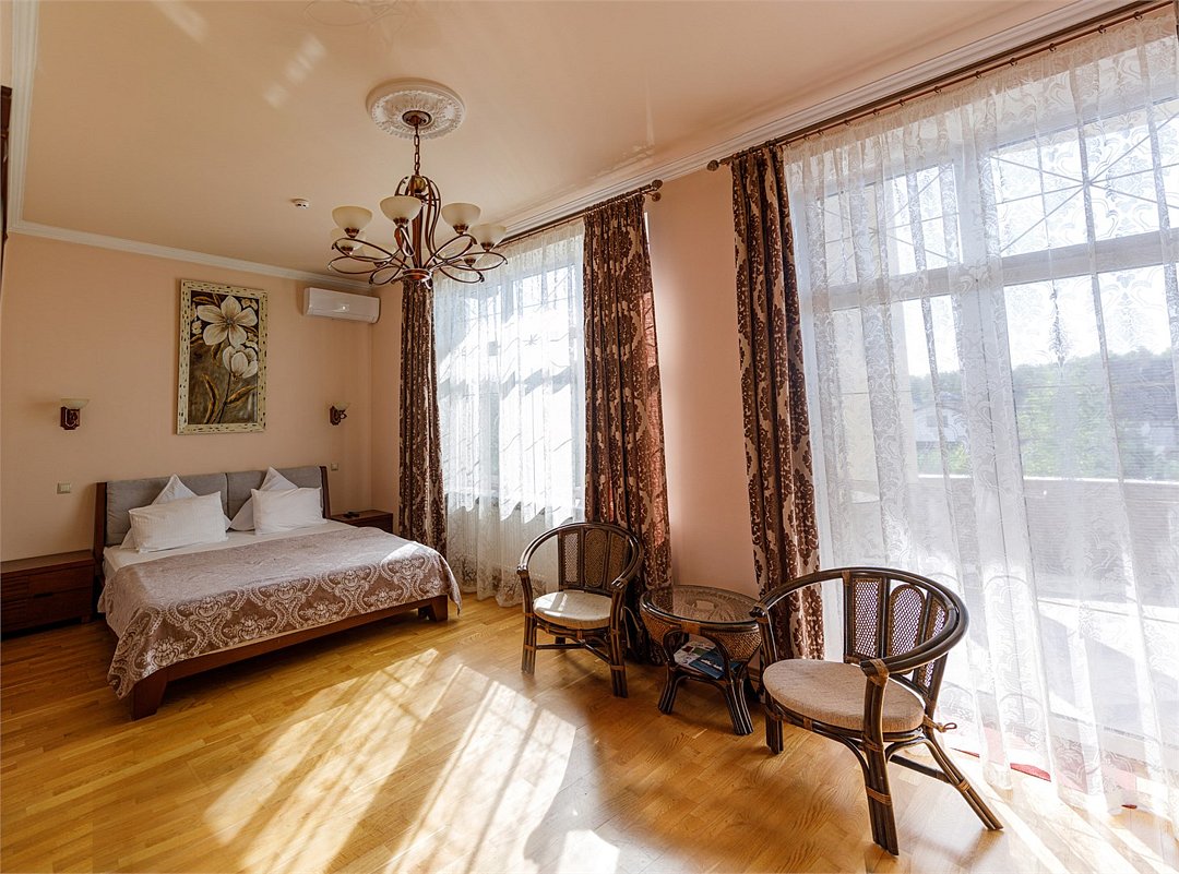Комната категории Люкс находятся в каждом коттедже на втором этаже. Просторная комната меблирована большой двуспальной кроватью, вместительным шкафом, телевизором. Есть выход на балкон В комнаты категорий Люкс — возможно предоставление 1 дополнительного места + 1 детская кровать. В большой ванной комнате есть гидромассажная ванна, биде, набор полотенец, гель для душа, шампунь.Услуги и удобства