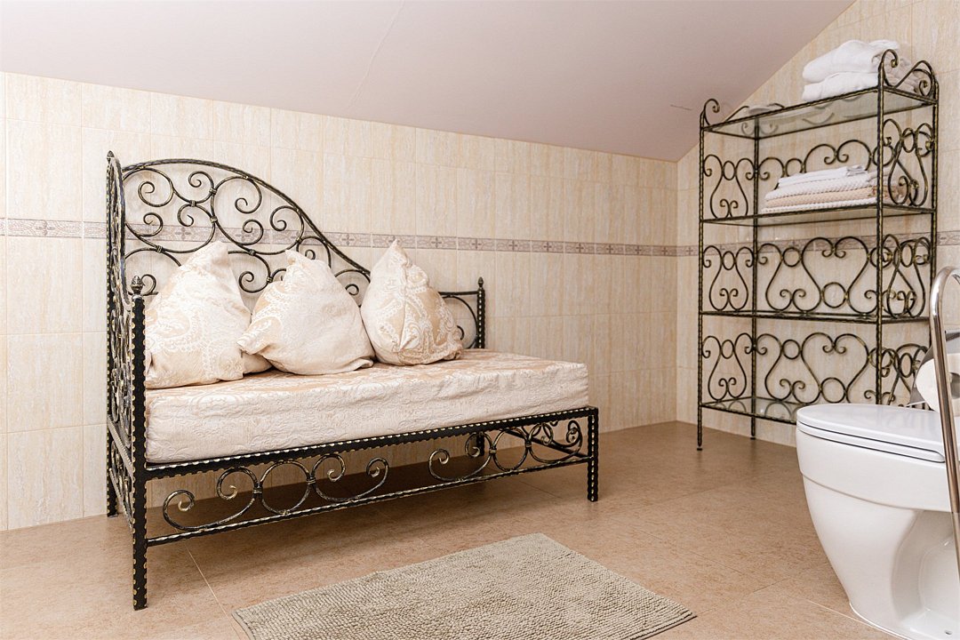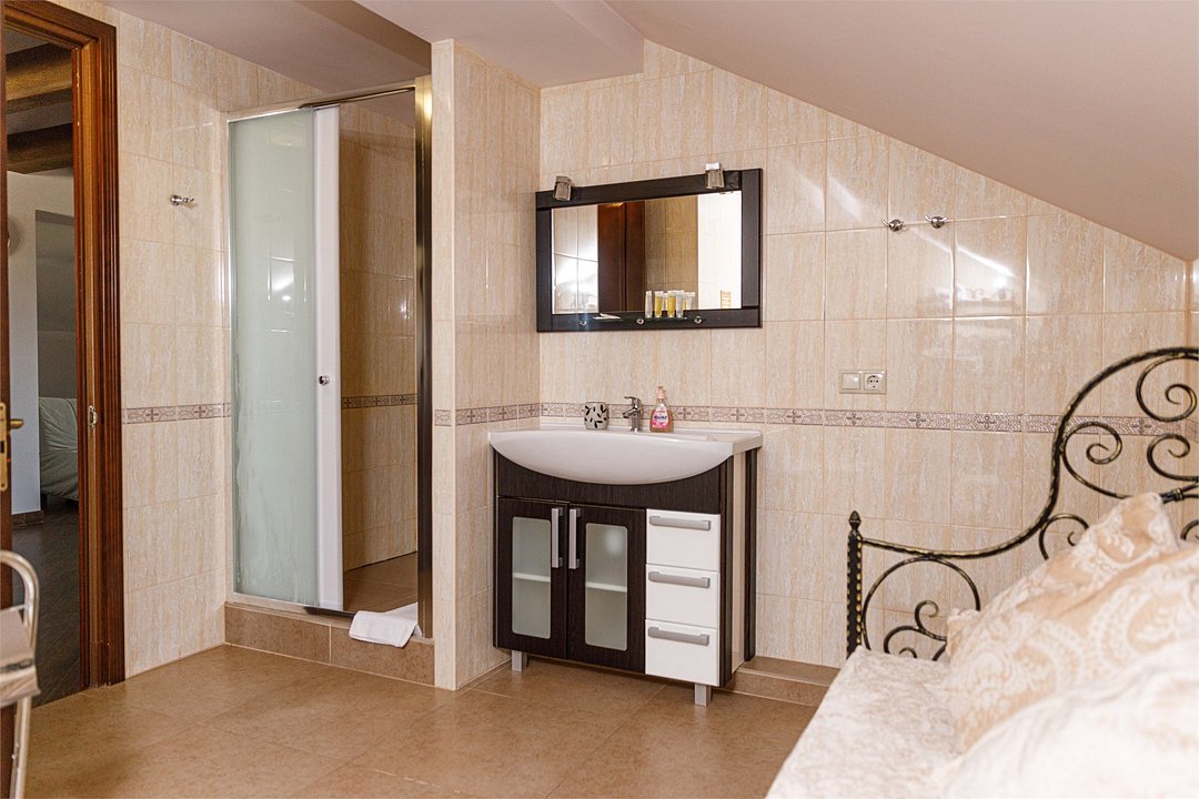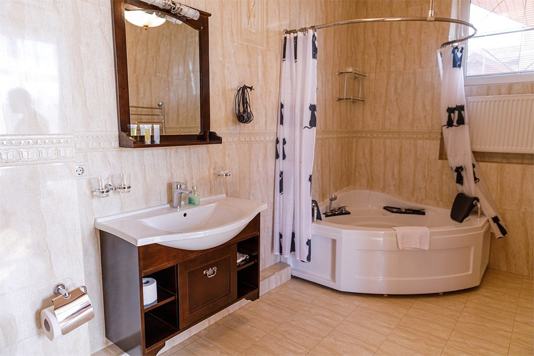 Просторный номер, с отдельным входом с улицы и отличной звукоизоляцией. Уровень пола возвышен над землей всего на одну ступень. Это очень удобно и безопасно для пар с маленькими детьми и для людей с ограниченными физическими возможностями. Состоит из трех комнат: прихожая, санузел, спальня. В прихожей имеется: холодильник, вешалка, зеркало и достаточно места для детской коляски. В комнате: большая двуспальная кровать, прикроватные тумбочки, гардероб с зеркалом, стол с двумя пуфами, телевизор, Wi-Fi, микроволновка, электрический чайник, чайный набор с посудой, кувшин с питьевой водой. Ванная комната оборудована душевой кабиной, умывальником, унитазом и биде.Услуги и удобства